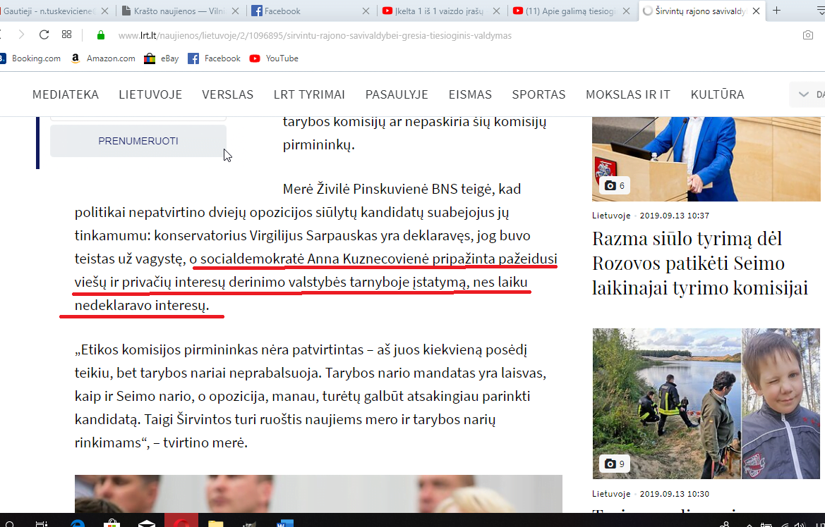 Merė BNS teigė, kad „socialdemokratė Anna Kuznecovienė pripažinta pažeidusi viešų ir privačių interesų derinimo valstybės tarnyboje įstatymą, nes laiku nedeklaravo interesų“. Taip, raštą savivaldybė gavo, jame dar kelios Etikos komisijos narių (ir ne tik jų) pavardės. Ir nusižengimas paminėtas. Deklaravę viešus ir privačius interesus kaip kandidatai į Tarybos narius, po rinkimų nepakeitė savo statuso į esamą Tarybos narį. Bet juk pačios deklaracijos yra. Komisija dar nenusprendė, o jei nusprendė, sprendimo niekur nepaskelbė. Kaip su nekaltumo prezumpcija, kuri galioja Lietuvoje? Ar jau visus teisime be teismo?