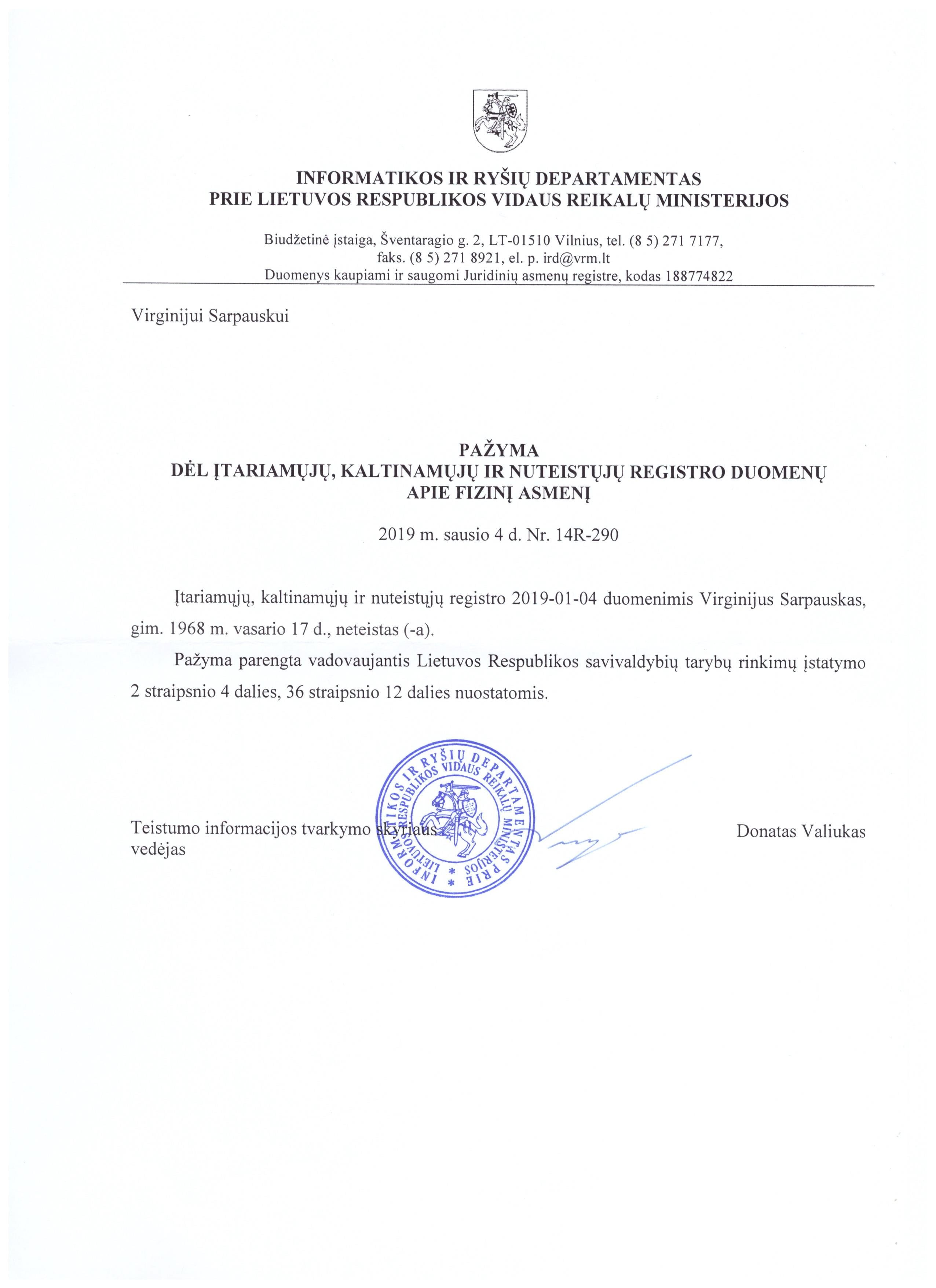 Virginijaus Sarpausko teistumas eskaluojamas nuo priešrinkiminio periodo. Tačiau prieš akis guli pažyma, kurioje rašoma „Įtariamųjų, kaltinamųjų ir nuteistųjų registro 2019-01-04 duomenimis Virginijus Sarpauskas, gim. 1968 m. vasario 17 d., neteistas“ (dokumentas nuotraukų galerijoje). Ir čia nėra kažkokio kriminalo. Skirtingose santvarkos, skirtingose valstybėse įstatymai skiriasi.