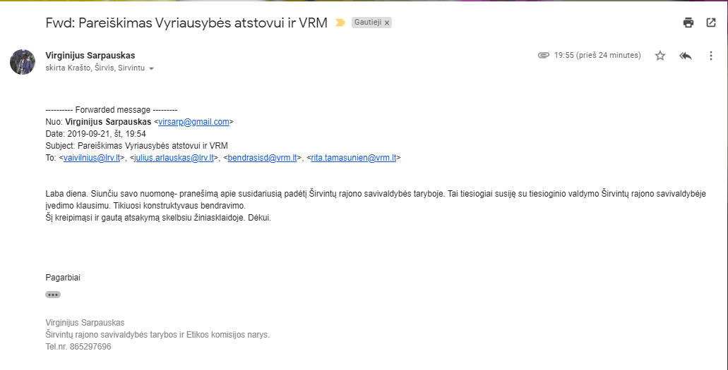 Taip pat manau, kad nuo pat 2019m. gegužės 28 dienos aukščiau minėtų balsavimo rezultatų teisinių pasekmių, kai buvo galimai pažeista Vietos savivaldos įstatymo 15 straipsnio 1 dalis, visi sekantys veiksmai ir balsavimai neturi jokios teisinės galios ir yra naikintini, nes iš neteisės teisė neatsiranda (ex in juria non oritur jus).