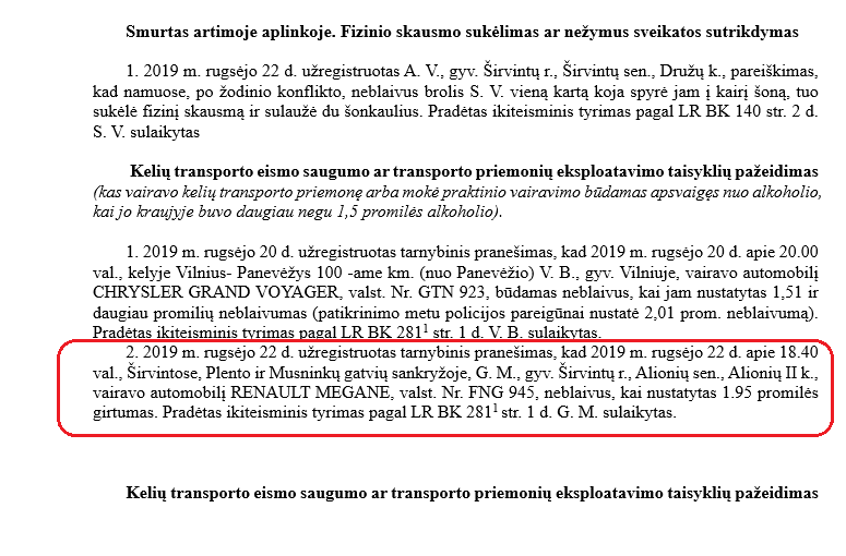 „Rugsėjo 22 d. apie 18 val. 40 min. Širvintų r., Širvintose, Plento ir Musninkų g. sankryžoje, neblaivus (1,95 prom.) vyras (gimęs 1991 m.) vairavo automobilį „Renault Megane“. Pradėtas ikiteisminis tyrimas pagal LR BK 2811 str. 1 d.? Tokia informacija paskelbta Policijos įvykių suvestinėje. Lyg ir viskas gerai, sulaikė neblaivų, paskelbė, bet…