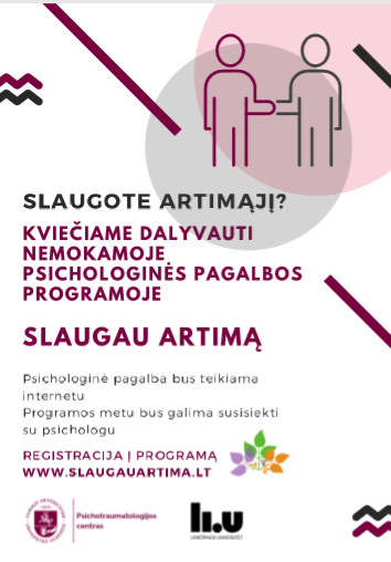 Nuo spalio mėnesio Vilniaus universiteto psichologai internetu pradeda teikti nemokamas konsultacijas savarankiškai slaugantiems artimuosius. „Slaugau artimą” programos mokslininkai atkreipia dėmesį, kad slaugymas yra sudėtingas ne tik pačiam ligoniui, bet ir slaugytoju tapusiam šeimos nariui. „Slaugau artimą” programa pasinaudoti bus galima du mėnesius.