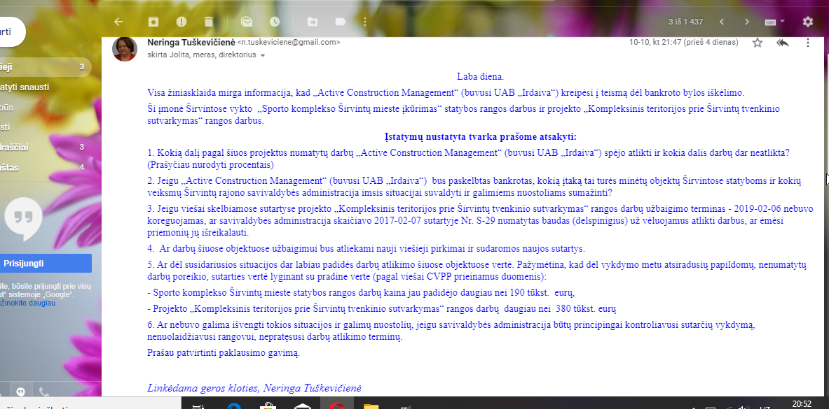 - Jeigu „Active Construction Management“ (buvusi UAB „Irdaiva“) bus paskelbtas bankrotas, kokią įtaką tai turės minėtų objektų Širvintose statyboms ir kokių veiksmų Širvintų rajono savivaldybės administracija imsis situacijai suvaldyti ir galimiems nuostoliams sumažinti?