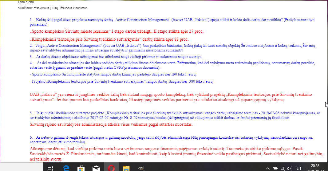 Po atsakymų mums kilo naujų klausimų. Pavyzdžiui, ar tikrai užsakovas, mokantis rangovui už darbą, neturi teisės žinoti, kur ir kaip naudojami sumokėti pinigai? Bet tuo domėsimės vėliau.