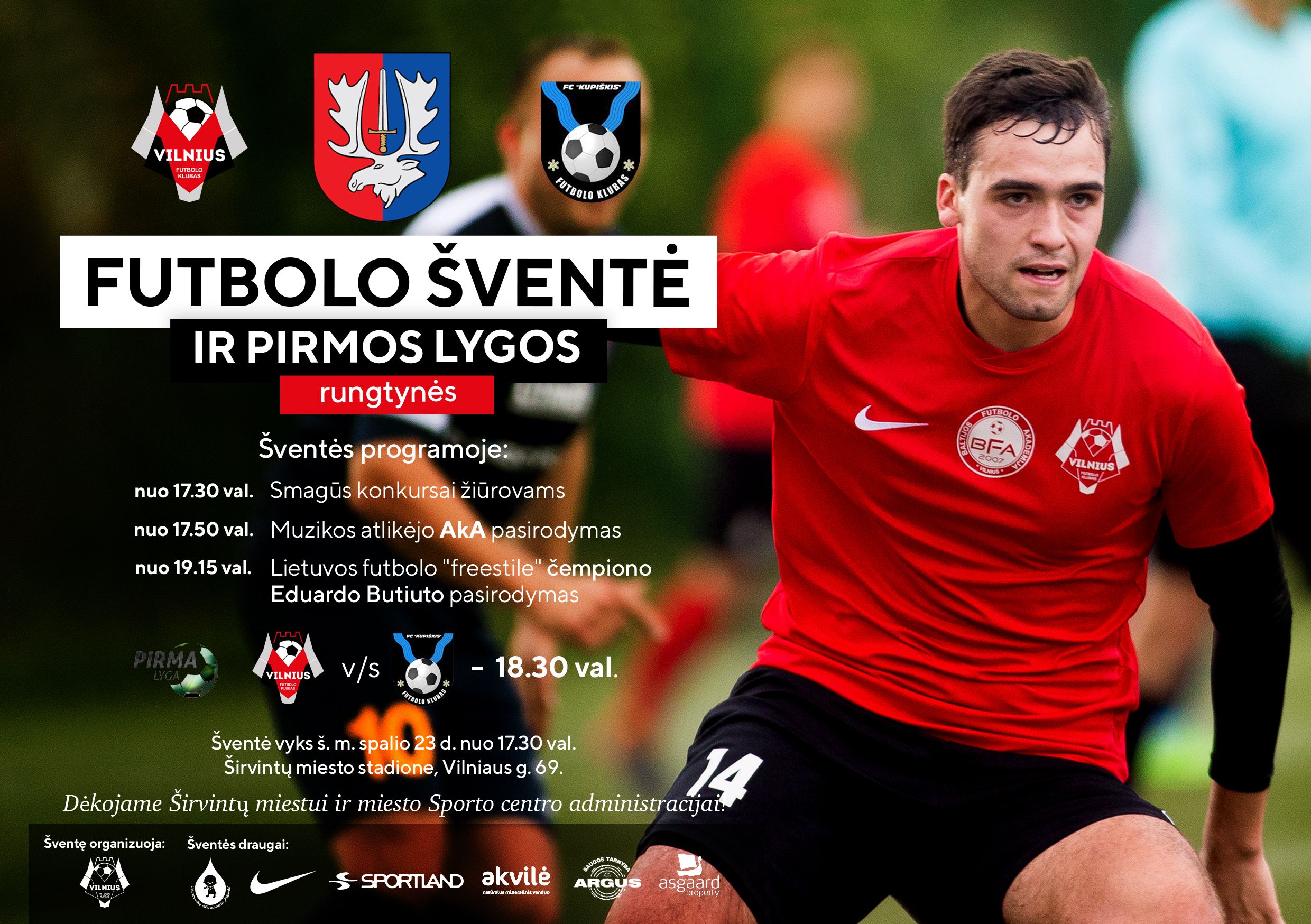 Šį trečiadienį, spalio 23 d., nuo 17.15 val. „Vilnius” kviečia visus širvintiškius, miesto svečius ir komandos gerbėjus į futbolo šventę Širvintų miesto stadione. Prieš šventę vyks aktyvios futbolo pramogos su futbolo mokyklos „Vilnius Kickers“ treneriais, šventės metu koncertuos atlikėjas AkA, rungtynių pertraukos metu savo pasirodymą pristatys Lietuvos futbolo „freestile“ čempionas Eduardas Butiuto. Klubas laukia miesto moksleivių ir darželinukų klasių, kuriems už aktyvumą žada prizų ir kitų staigmenų. Kaip visada klubas rinks aukas partnerei „Lietuvos vaikų vėžio asociacijai „Paguoda“.