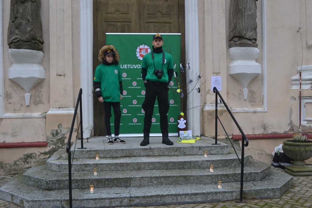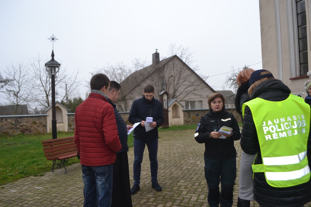 Pareigūnės Olesia ir Ginta priminė kelių eismo taisykles pėstiesiems ir dviratininkams. Akcentavo, kaip saugiai automobilyje vežti vaikus. Po šventų mišių pareigūnės dalijo laiškus senoliams ir vairuotojams, pasakojo, kaip apsisaugoti nuo telefoninių sukčių. Jaunieji policijos rėmėjai dalino atšvaitus, lankstinukus, saugos liemenes.