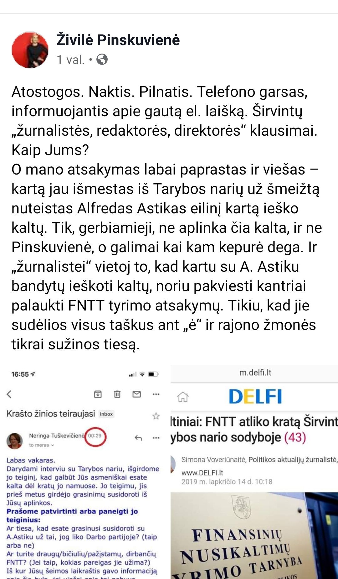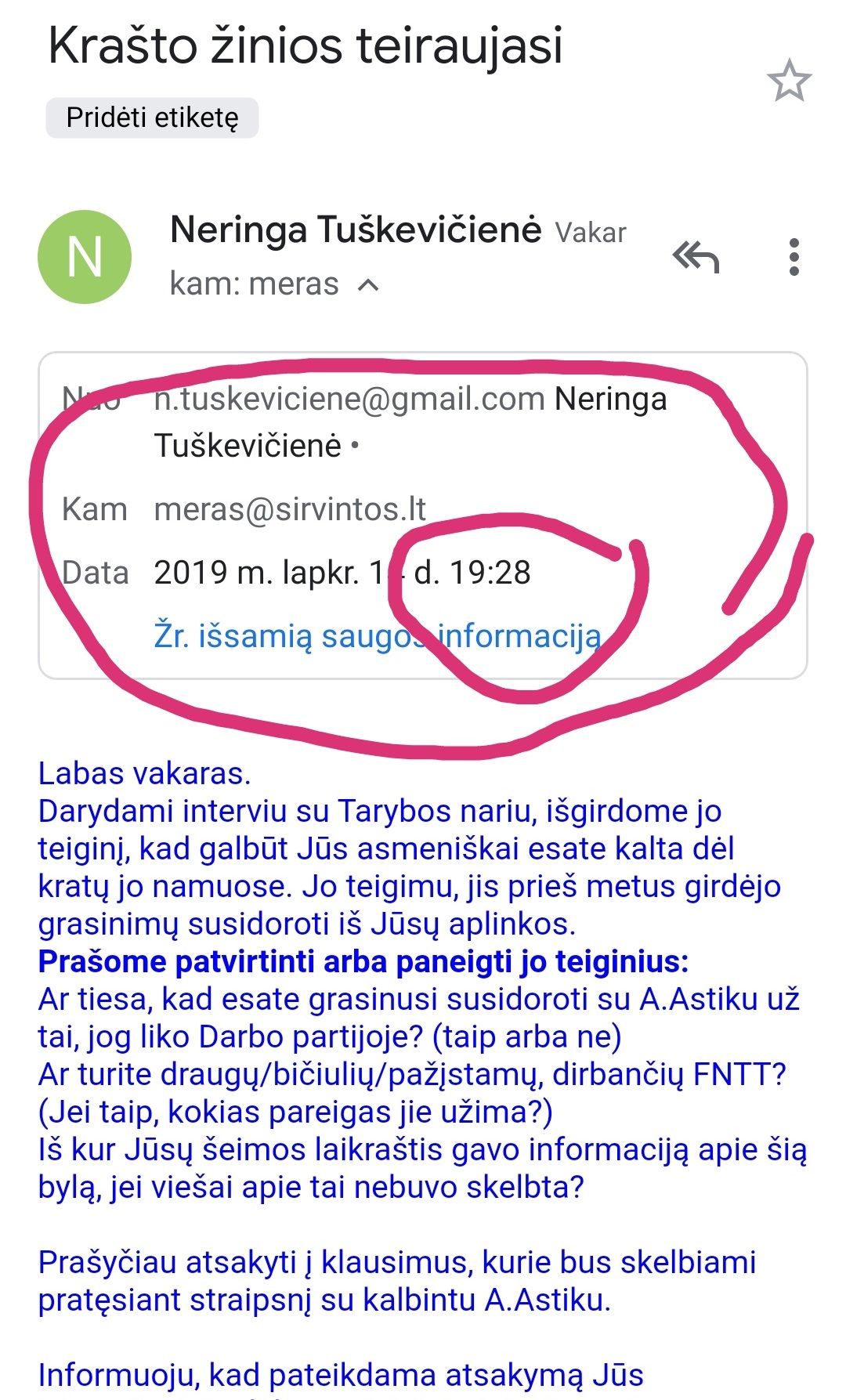 Parašytas paklausimas merei asmeniškai. Išsiųstas 19.29 val. Lietuvos laiku. Taip, mačiau, kad ji atostogauja. Bet niekas nepranešė, kur. Neturiu ekstrasenso galių ir negalėjau matyti, kad ji per penkias laiko juostas nuo čia. Be to, paklausimas siųstas į darbinį el.paštą. Tad tikėtina, kad jis naudojamas tik darbe ir darbo metu. Ko supyko merė? Kad ją laiškas pasiekė naktį. Tačiau sąmoningai nutylėjo, kad ji išvykusi ir laikas skiriasi. O dalies tiesos nutylėjimas jau yra melas. Bet suprantu merę, juk taip reikia, kad jos pasekėjai įtikėtų blogąja Tuškevičiene. O gal po tokių patyčių ims ir užsičiaups. Juk prieš rinkimus gerai būtų.