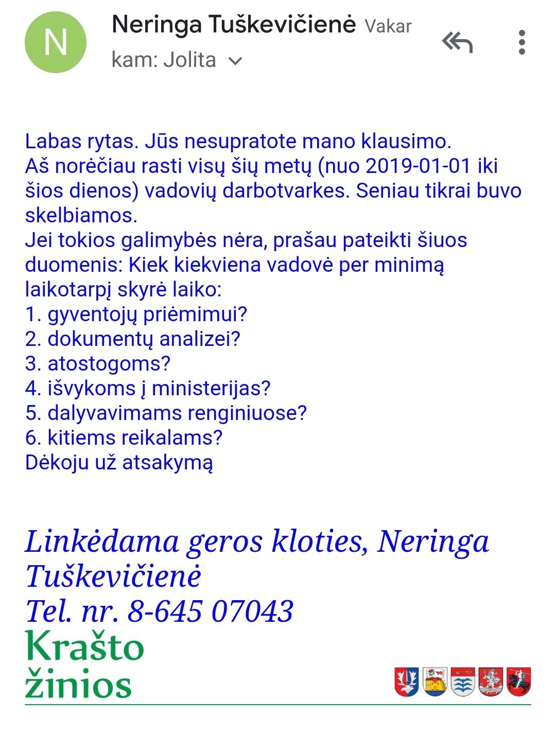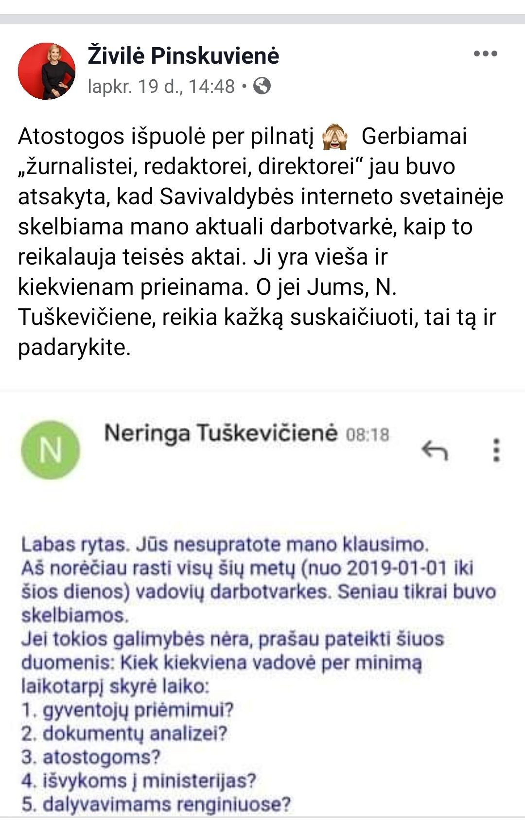 Atstovei spaudai parašytas elementarus paklausimas dėl savivaldybės vadovių darbotvarkių. Vėliau paprašyta patikslinti informaciją. Ir merė įsiuto. Spėju, kad net ir atostogaudama reguliuoja, ką atsakyti. Kito paaiškinimo, kodėl paprasti klausimai (juos pridėsiu) pasiekė merę ir dar šitaip supykdė. Beje, pykti dėl mano noro pastudijuoti darbotvarkę nebuvo pagrindo. Darbo užmokestis vadovėms mokamas iš mokesčių mokėtojų lėšų, tad natūralu, kad jie turi teisę žinoti, kiek laiko vadovės skiria susitikimams su gyventojais, vizitams pas ministrus, renginių lankymui, kitiems klausimams ir atostogoms. Baigiantis metams man rūpėjo elementari statistika.