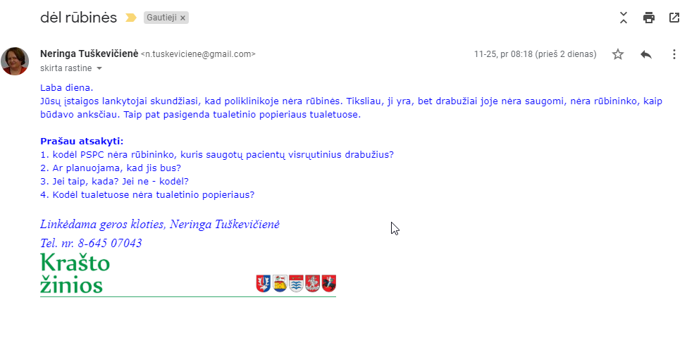 Grįždama namo vis galvoju apie įvykusį pokalbį. Skambinanti draugė man pasako, kad į gydytojo kabinetą jau einanti su paltu rankose. Čia pat priduria, kad gydytoja net pastabos nedavė. Vadinasi, ji žinanti esamą situaciją įstaigoje.