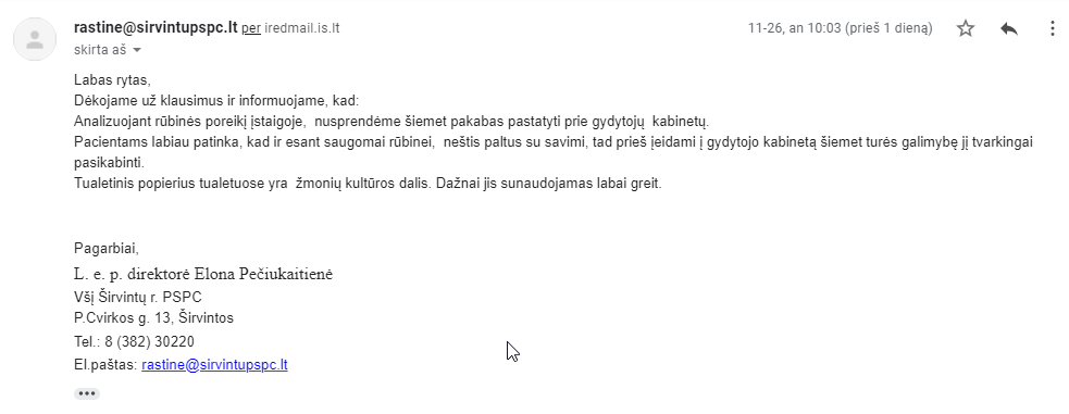 Paaiškintis situaciją kreipiuosi į Širvintų PSPC laikiną vadovę Eloną Pečiukaitienę.