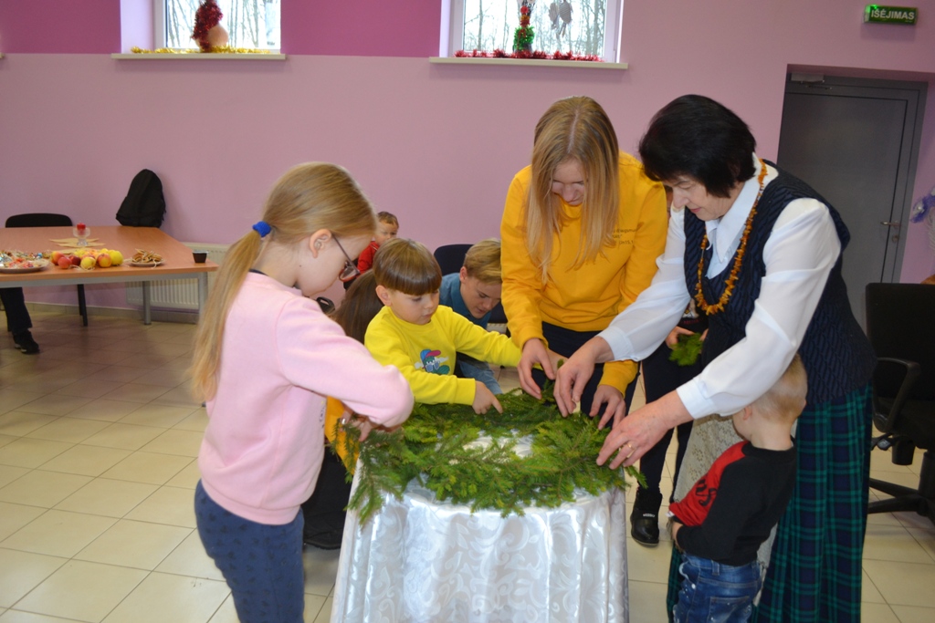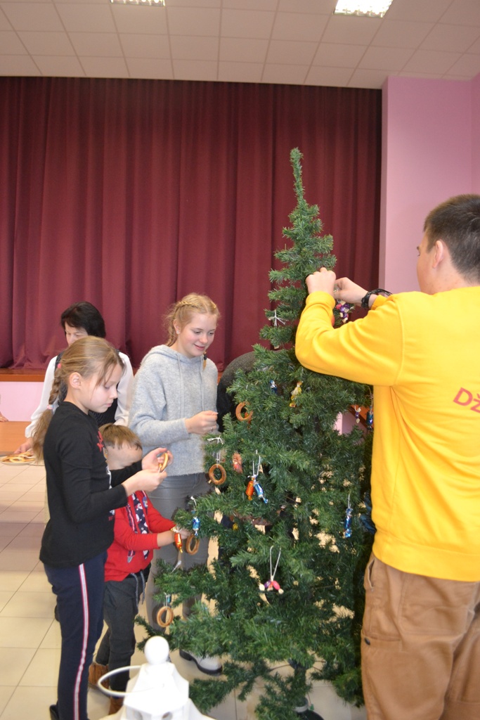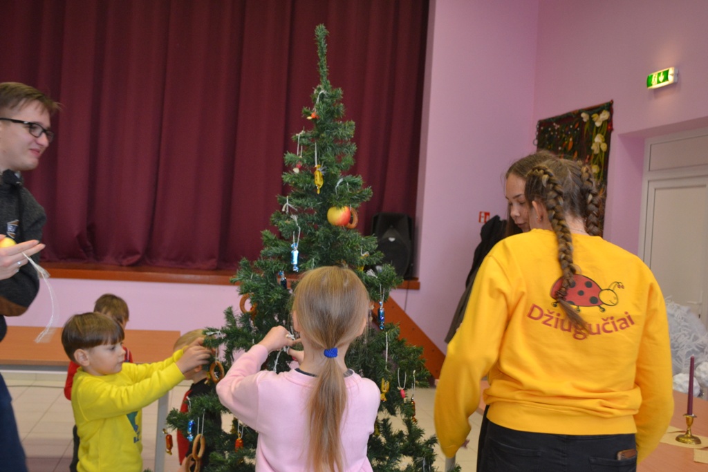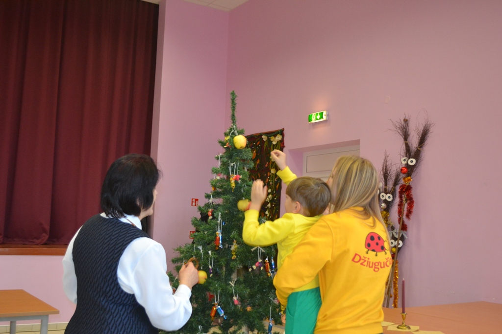 Vaikai ypač džiugiai priėmė kvietimą papuošti eglutę. Ant eglutės buvo kabinami riestainiai, sausainiai, saldainiai ir obuoliai. Visų nuostabai – eglutė atrodė išties graži. Asta papasakojo, kad vaikystėje ją brolis pamokino išlukštenti saldainį ir į jo vietą suvynioti duonos. Tai gaudavo barti išdykėlė už tokią išdaigą…