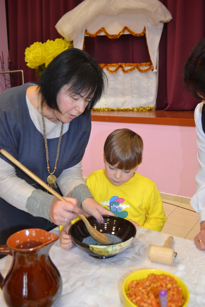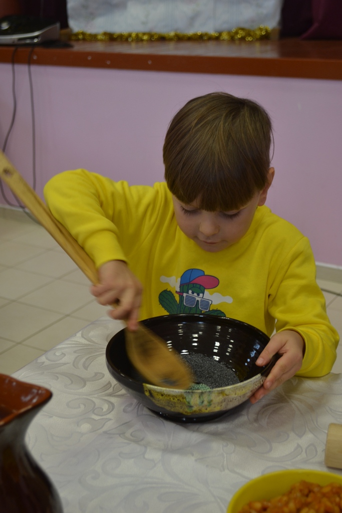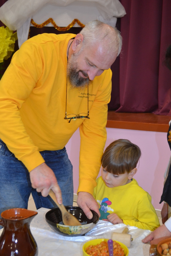 Gaminant maisto patiekalus taip pat prireikdavo tėčio pagalbos. Kad ir aguonas sutrinti aguonpieniui. Oi kaip nelengva mediniu šaukštu jas trinti… Čia pat šį darbą išbandė vaikai ir tėčiai.