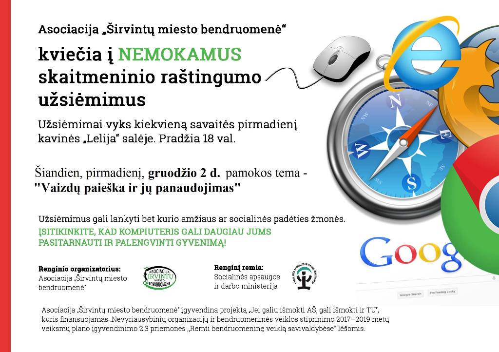 Asociacija „Širvintų miesto bendruomenė” vykdo projektą „Jei galiu išmokti Aš, gali išmokti ir Tu”, kurį finansuoja Socialinės apsaugos ir darbo ministerija. Šio projekto metu, bendruomenė kviečia į nemokamus skaitmeninio raštingumo užsiėmimus. Juos lankyti gali bet kurio amžiaus žmonės. Jau greitai persikelsime prie kompiuterių tam, kad praktinių užsiėmimų metu galėtumėm išbandyti ir atrasti naujas, skaitmeninių technologijų teikiamas galimybes. Kviečiame mokytis kartu!