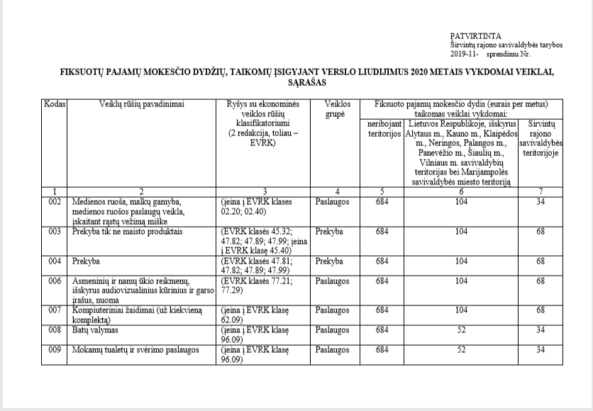 Atsižvelgiant į Širvintų rajono verslo plėtros komisijos pateiktus siūlymus, didinami fiksuotų pajamų mokesčių dydžiai, taikomi veiklai, vykdomai Širvintų rajono savivaldybės teritorijoje.