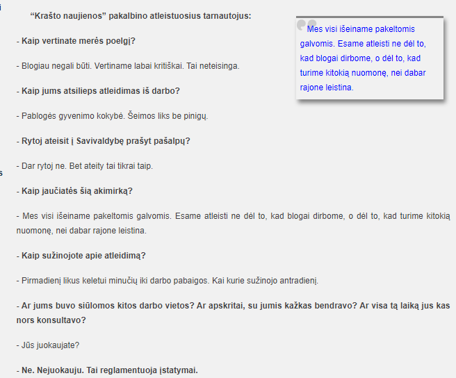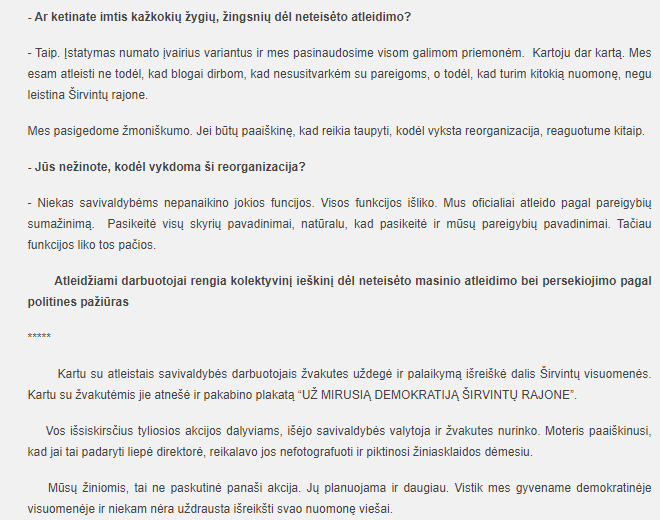 Degdami žvakutes už mirusią demokratiją kalbinami atleistieji tvirtino: „Mes visi išeiname pakeltomis galvomis. Esame atleisti ne dėl to, kad blogai dirbome, o dėl to, kad turime kitokią nuomonę, nei dabar rajone leistina.”