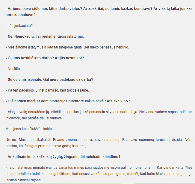 Ir išties nedrįstu berti druskos ant gyjančių žaizdų (todėl neminiu nė vieno vardo). Tokių prašymų išgirdau net ne vieną. Būdama šalia mačiau kiekvieno skausmą ir neviltį. Tad kiekvienam, kuris pripažintas neteisėtai atleistas, kiekvienam, kuris nedrįso eiti į teismą, kiekvienam, kurie šiuo metu yra „paskatinti” išeiti iš darbo „savo noru” noriu pasakyti: ačiū už jūsų drąsą, už tai, kad mes galėjome įsitikinti profesionaliais Širvintų ir Lietuvos teisėjais ir patikėti, kad teisingumas nors ir labai sunkiai, bet nugali.