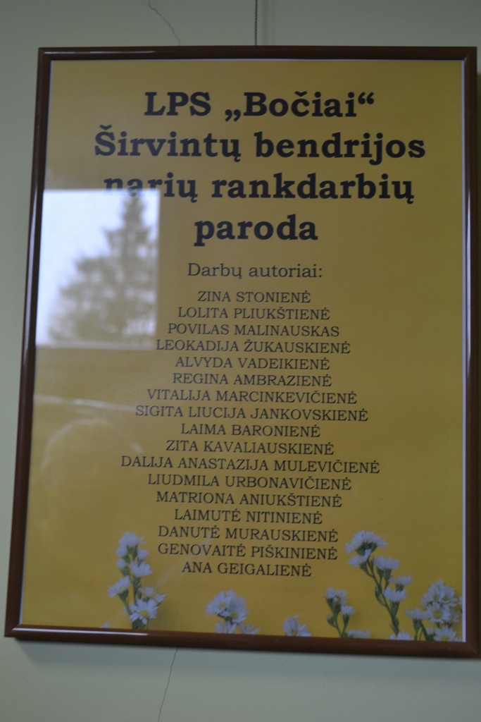 Tokiomis literatės Bronislavos Černiauskienės eilėmis labai tinka apibūdinti Širvintų I.Šeiniaus viešojoje bibliotekoje atidarytą gražią LPS „Bočiai“ Širvintų bendrijos narių rankdarbių parodą, kurios dalyviai savo darbščiomis rankomis kuria stebuklus. Savo darbus pristatė net septyniolikos autorių kolektyvas: Zina Stonienė, Lolita Pliukštienė, Povilas Malinauskas, Leokadija Žukauskienė, Alvyda Vadeikienė, Regina Ambrazienė, Vitalija Marcinkevičienė, Sigita Liucija Jankovskienė, Laima Baronienė, Zita Kavaliauskienė, Dalija Anastazija Mulevičienė, Liudmila Urbonavičienė, Matriona Aniukštienė, Laimutė Nitinienė, Danutė Murauskienė, Genovaitė Piškinienė, Ana Geigalienė.