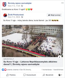 2020 m. kovo 11 diena. Paėjus kelioms valandoms Širvintų rajono savivaldybė Facebook pasidalina merės šventiniu sveikinimu. Aptarnaujantis personalas visada taip elgiasi. Dėl visa ko prideda valstybės atkūrimo trisdešimtmečiui tinkanti tekstą: ,,Sveikiname su Kovo 11-ąja!!! 💛💚❤️”