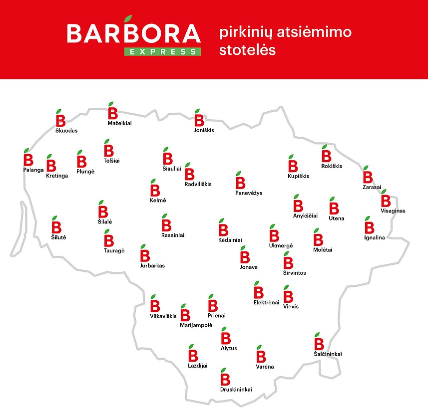 Elektroninė maisto ir kasdienių prekių parduotuvė „Barbora“ žengia į regionus ir kitą savaitę pristatys naują paslaugą. Pirkinių atsiėmimo stotelių tinklas padengs visas Lietuvos apskritis. „Barboros“ pirkinių atsiėmimo stotelės atsiras 38-ių šalies miestų ir miestelių „Maxima“ parduotuvėse. Daugiau informacijos įmonė žada pateikti pirmadienį.
