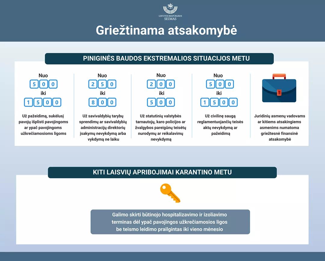 Pataisose siūloma taikyti didesnes baudas už karantino ir saviizoliacijos taisyklių pažeidimus ekstremaliosios situacijos metu. Iki šiol už pažeidimus fiziniams asmenims Administracinių nusižengimų kodeksas numatė įspėjimą arba baudą nuo 60 iki 140 eurų, o įsigaliojus pataisoms bauda būtų nuo 500 iki 1 500 eurų. Atitinkamai didės baudos ir juridiniams asmenims bei jų vadovams: dabar – nuo 140 iki 600 eurų, ir bus – nuo 1 500 iki 6 000 eurų.