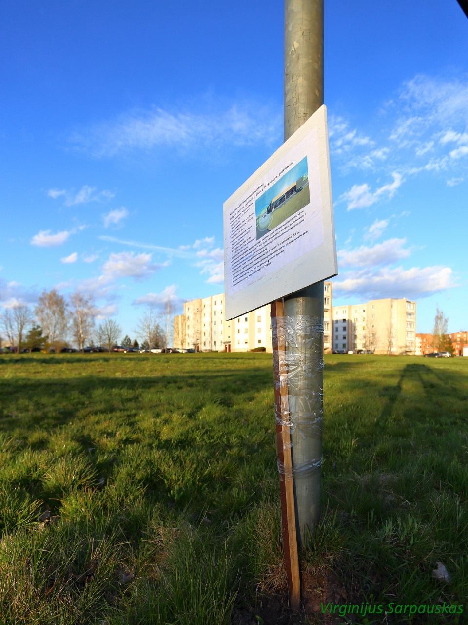 Nuvažiuoju vakar į planuojamo prekybos centro vietą pasižiūrėti, kokia iš tiesų padėtis. Jau geriau būtų man pamelavę… Bet ne. Prie degalinės, tolimiausiame kampe nuo daugiabučio namo, stovi stendas, skirtas už europines lėšas vykdomų projektų viešinimui. Prie jo metalinės atramos, apie 70 centimetrų nuo žemės, lipnia juosta pritvirtintas informacinis skelbimas, apie planuojamo prekybos centro projektinius siūlymus. Lentos dydis gal A3 lapo formato dydžio.