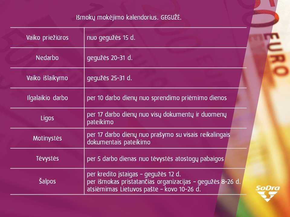 Kitos – ligos, motinystės socialinio draudimo išmokos bei pensijos gyventojams gegužę taip pat mokamos pagal nustatytą grafiką.