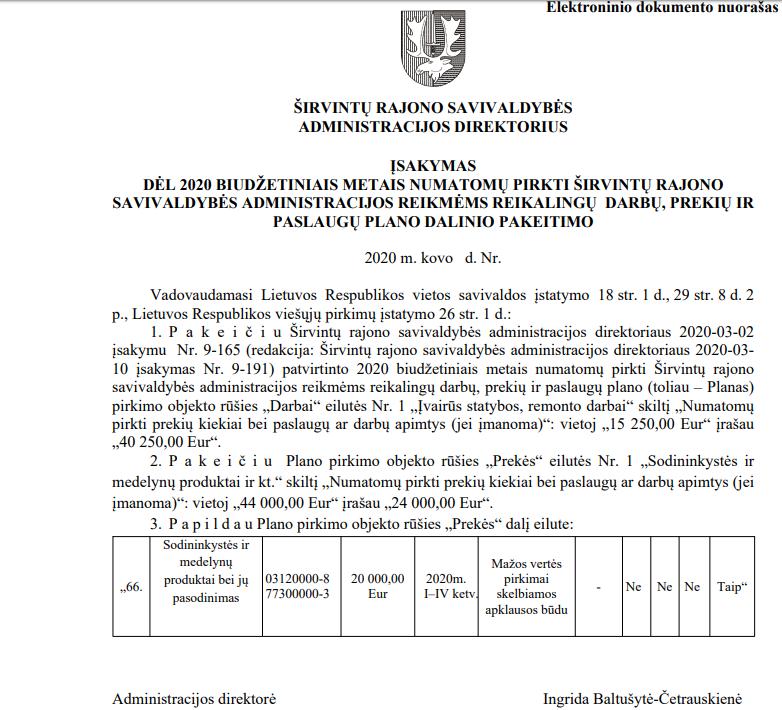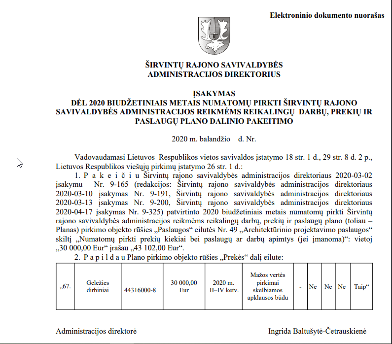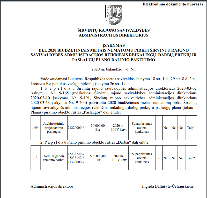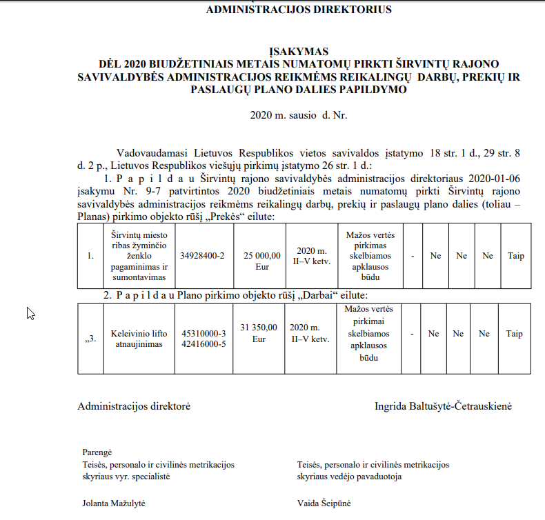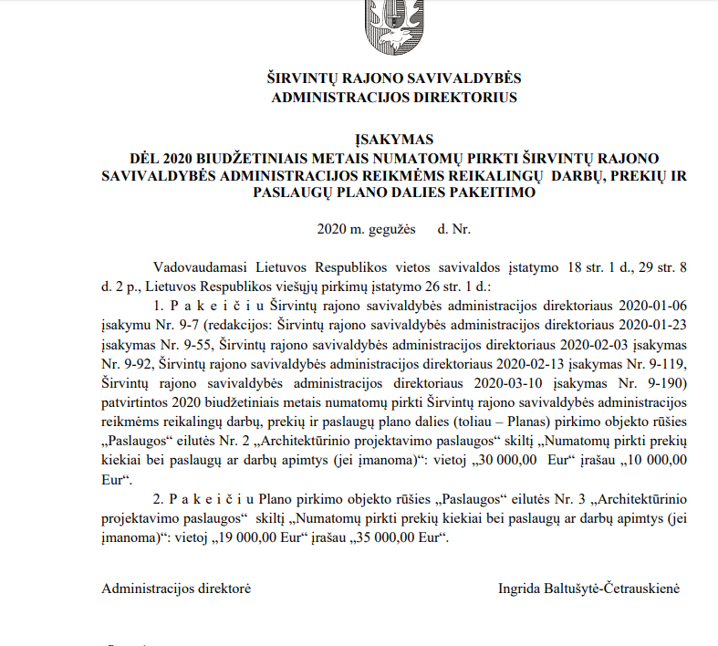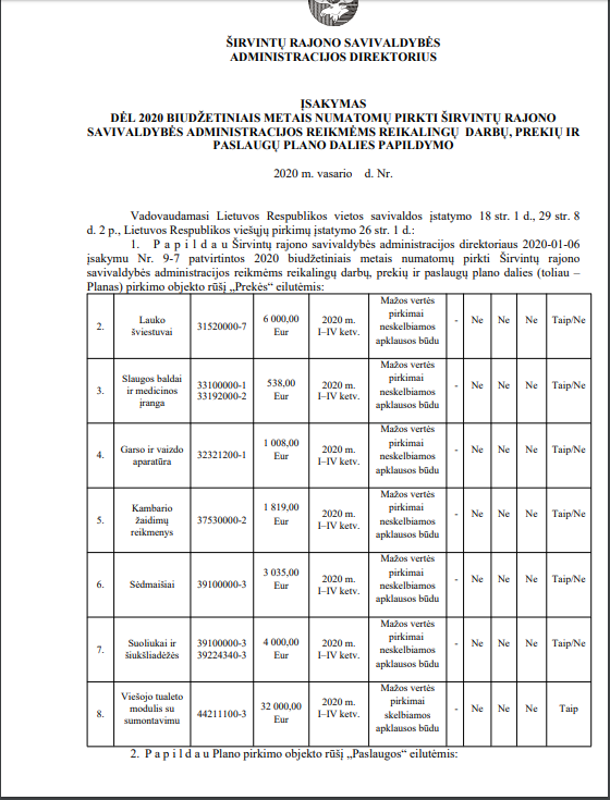Šiais metais (ir praėjusių metų pabaigoje) vis dar nėra paskelbtas (mes jo neradome) administracijos direktorės įsakymas dėl 2020 biudžetiniais metais numatomų pirkti Širvintų rajono savivaldybės administracijos reikmėms reikalingų darbų, prekių ir paslaugų plano. Tiesa, atidžiai studijuodami direktorės įsakymus radome net ne vieną šio neskelbto plano papildymą.