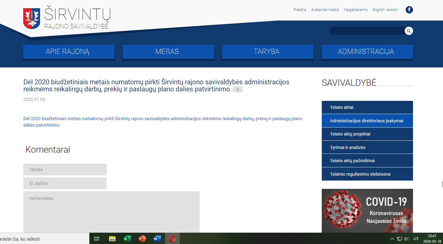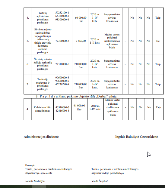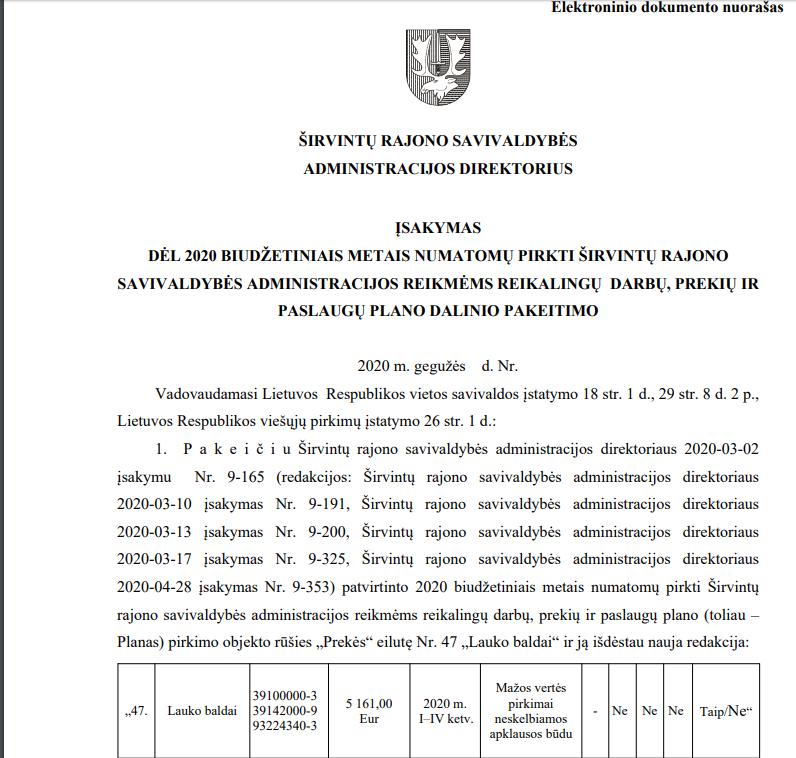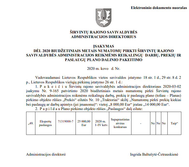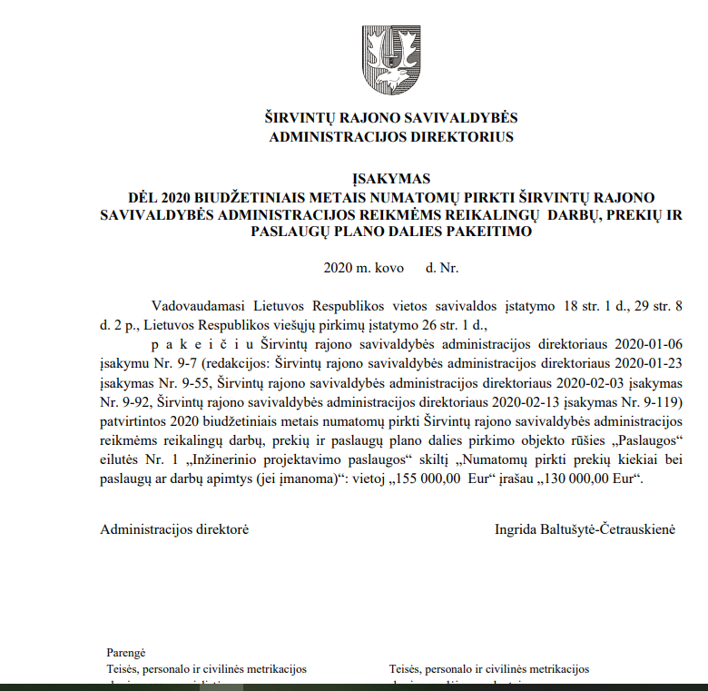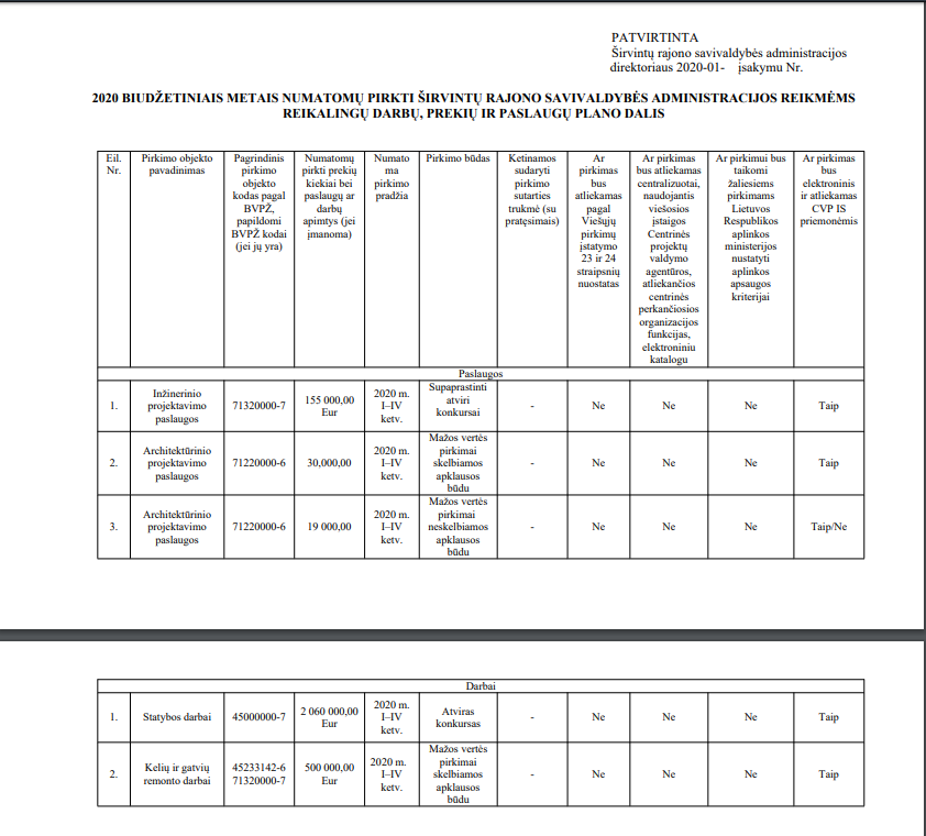 Šiais metais (ir praėjusių metų pabaigoje) vis dar nėra paskelbtas (mes jo neradome) administracijos direktorės įsakymas dėl 2020 biudžetiniais metais numatomų pirkti Širvintų rajono savivaldybės administracijos reikmėms reikalingų darbų, prekių ir paslaugų plano. Tiesa, atidžiai studijuodami direktorės įsakymus radome net ne vieną šio neskelbto plano papildymą.