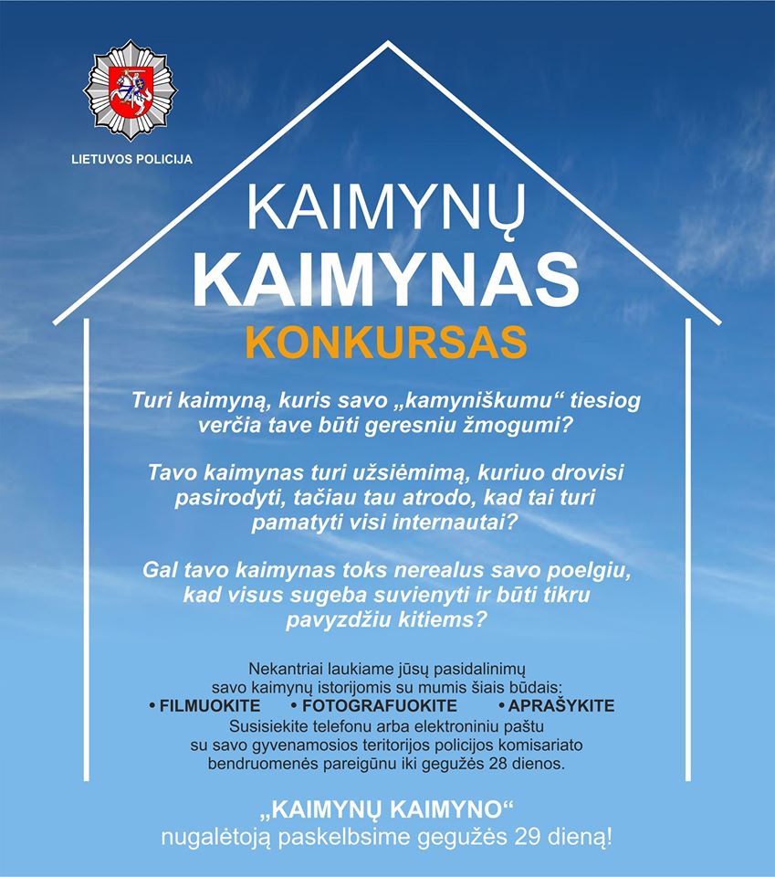 Jums tereikia nufilmuoti ar nufotografuoti kaimyną, aprašyti trumpą istoriją, kodėl jis vertas šio vardo ir iki gegužės 28 d. kaimynų kaimyno sėkmės istoriją siųskite mums el.p. ginta.cepiene@policija.lt