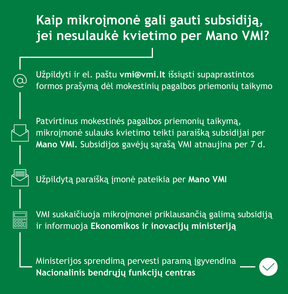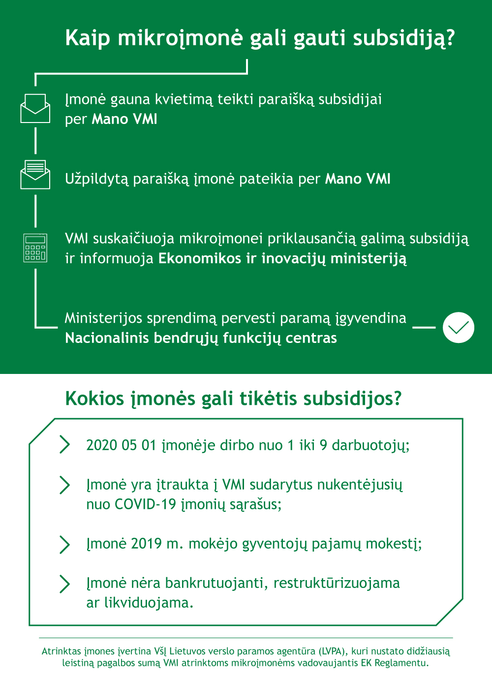 Pažymėtina, kad įmonėms apskaičiuotą subsidijų sumą VMI pateikia Ekonomikos ir inovacijų ministerijai. Pastarajai priėmus teigiamą sprendimą dėl subsidijos skyrimo, įmonei skirtas subsidijas perves Nacionalinis bendrųjų funkcijų centras.