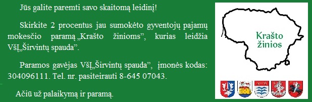 Paremkite „Krašto žinias”. Skirkite 1,2 % jau sumokėto gyventojų pajamų mokesčio paramą „Krašto žinioms”, kurias leidžia VšĮ„Širvintų spauda”.