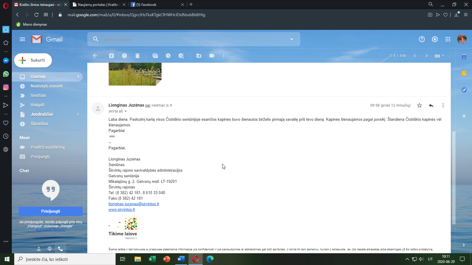 Gavusi signalą ir dar patvirtinimą siunčiu paklausimą laikinajam seniūnui. Seniūną Lionginą Juzėną galima pagirti – atsakė itin operatyviai (maždaug per valandą). Toks operatyvumas nėra būdingas dabartinei valdžiai. Už tai pagarba.
