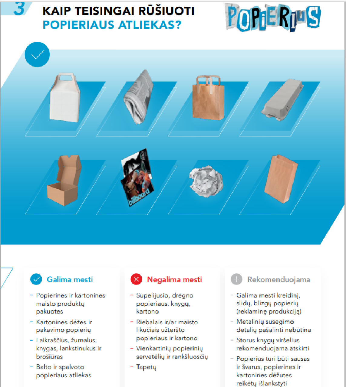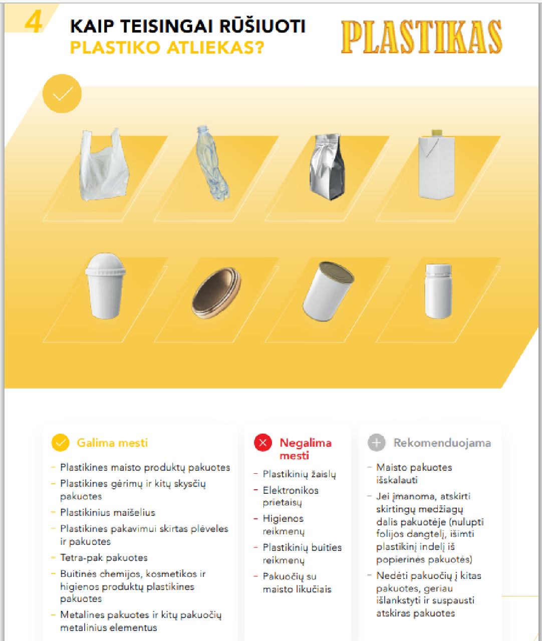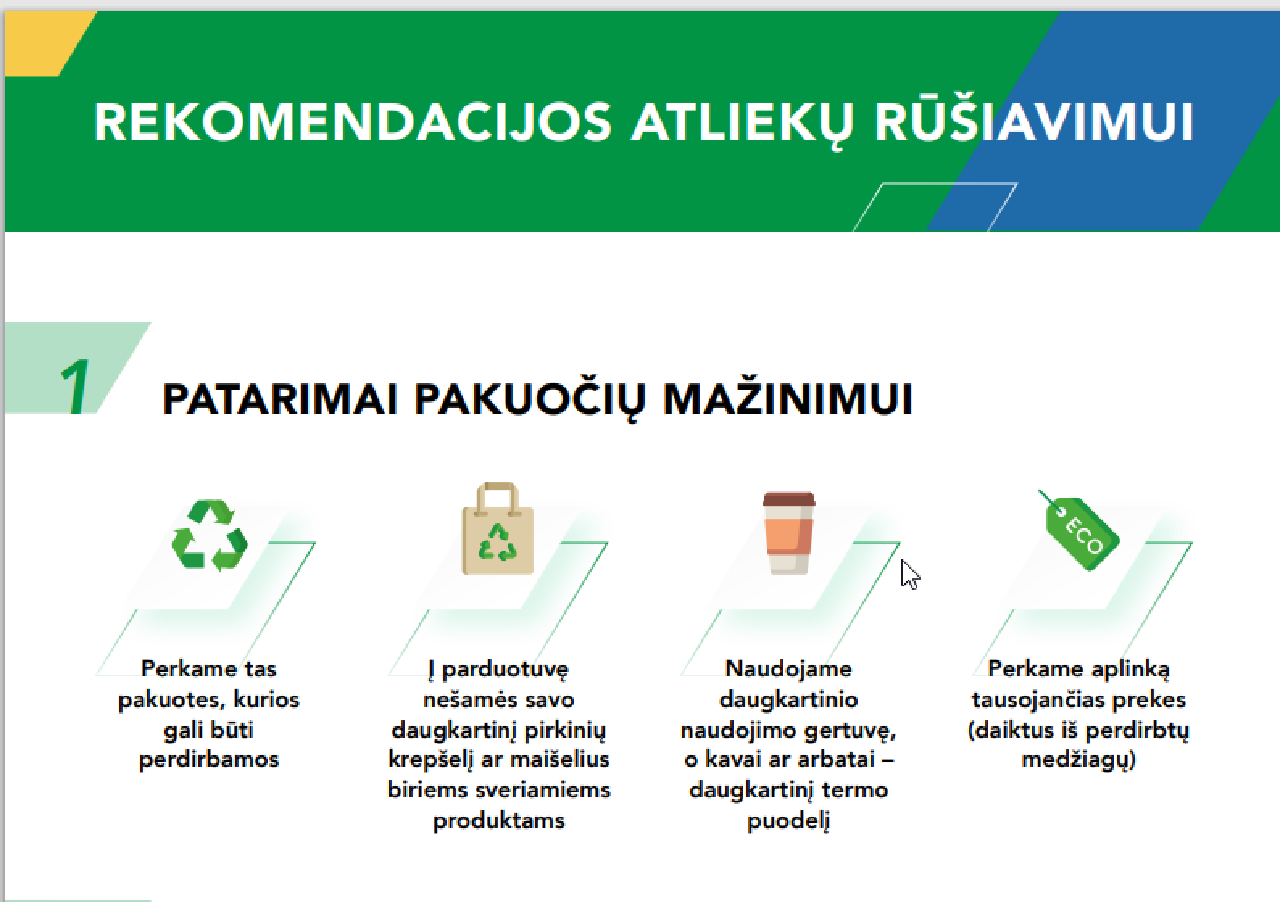 Prisegame atnaujintas rekomendacijas pakuočių atliekų rūšiavimui – jose rasite gyventojams pateiktus paprastus atsakymus į klausimus „Kaip mažinti pakuočių kiekį?“, „Kodėl reikia rūšiuoti?“ ir – „Kaip teisingai rūšiuoti popieriaus, plastiko, stiklo atliekas – ką mesti? Ko nemesti? Ir kas tik rekomenduotina?“