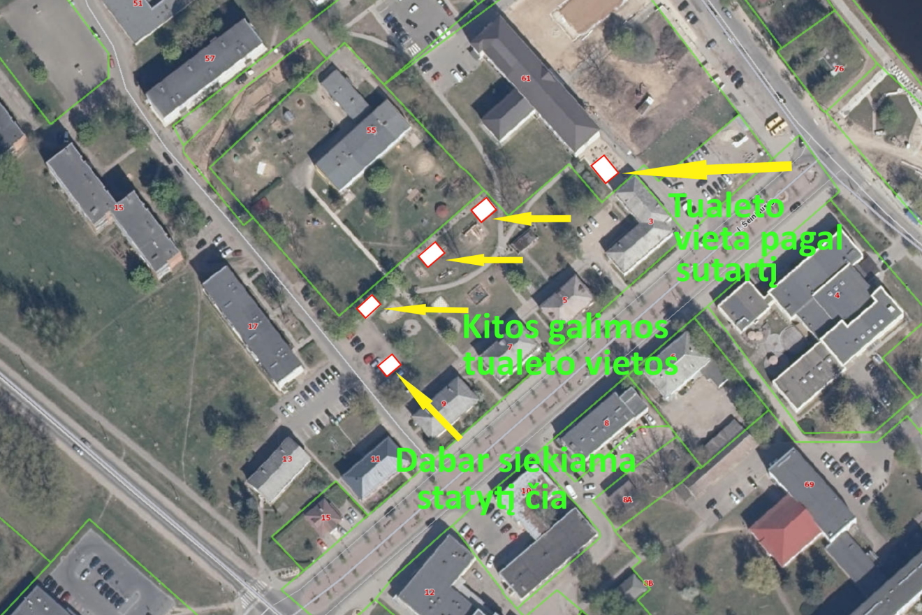 Kaip teigė susirinkę gyventojai, jie apie konkrečią vietą, kur planuojama statyti tualetą sužinojo iš merės dukros laikraščio. Ten teigiama, kad tualetas stovės prie pat I.Šeiniaus g. 9 namo, mašinų stovėjimo aikštelėje. Negali kilti jokių dvejonių, jeigu pati merė nuotraukose nurodo konkrečią vietą.
