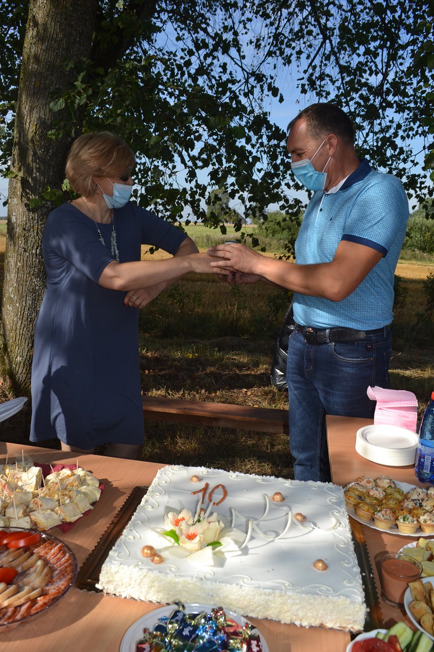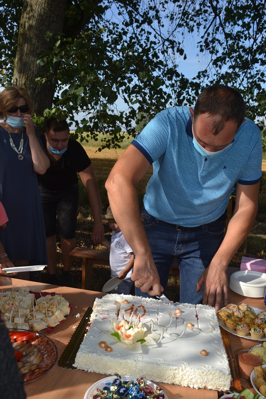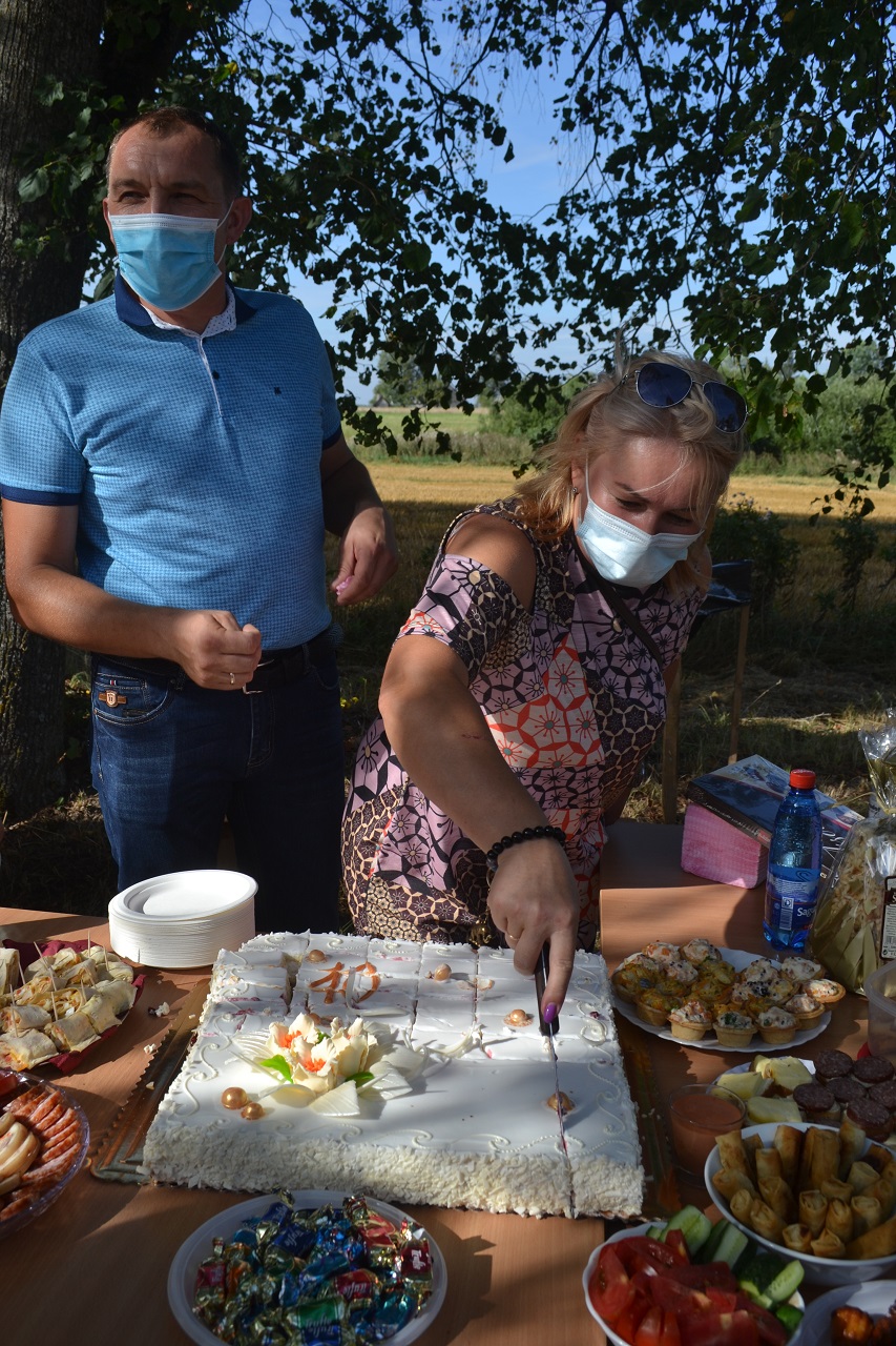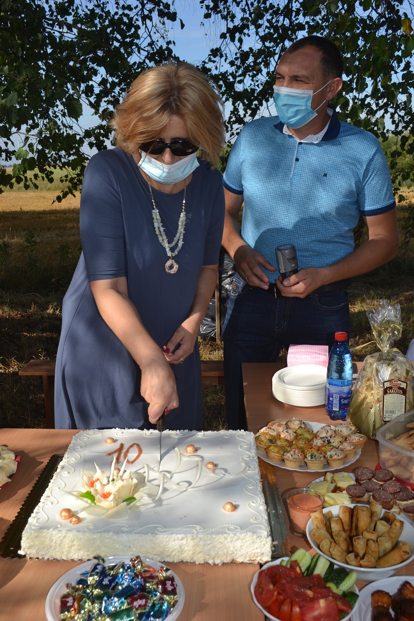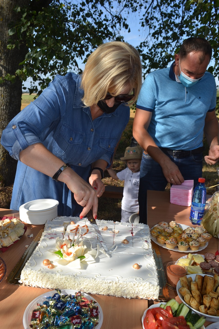 Buvusi pirmininkė ir naujasis pirmininkas, seniūnė pjaustė jubiliejinį tortą ir dalijo svečiams. Visi smagiai leido laiką, čia pat žaidė ir krykštavo laimingi vaikai.