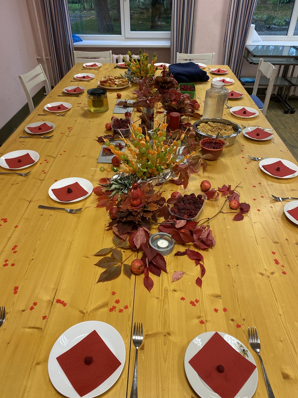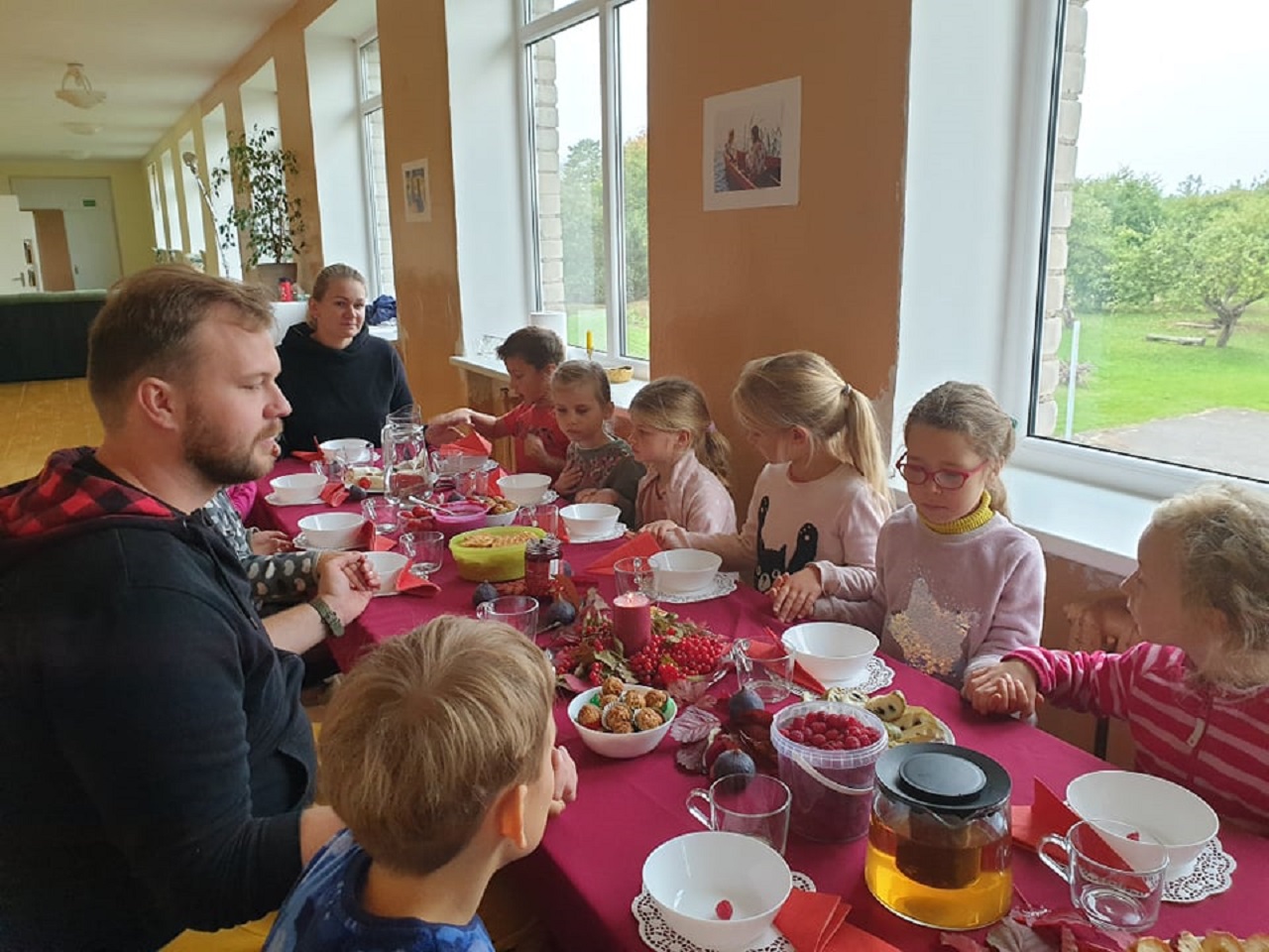Šventinė nuotaika prasidėjo nuo pat ryto, kai vaikai po rytinės mankštos ir ryto rato, rado šventinius mamų ruoštus pusryčius ant rudeniškai dekoruotų stalų. Pagrindinė dekoracijų sumanytoja – mama Kristina, kuri yra WhiteCloudsArt įkūrėja – išmoningai sujungusi rudeninės gamtos grožybes, sukūrė pakilias Mykolinių nuotaikas „Tėkmės“ mokykloje.