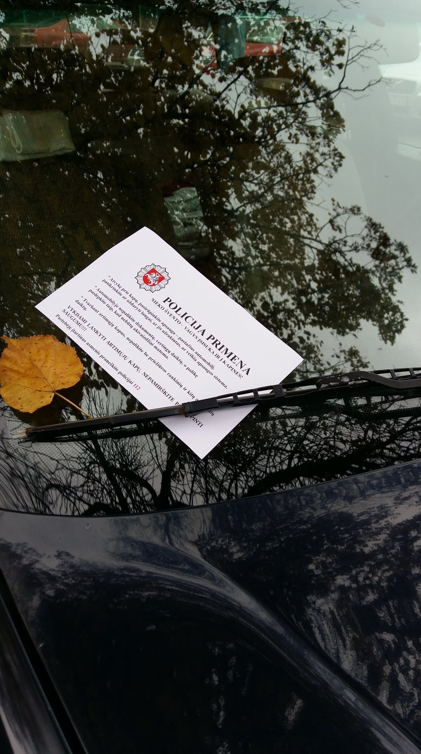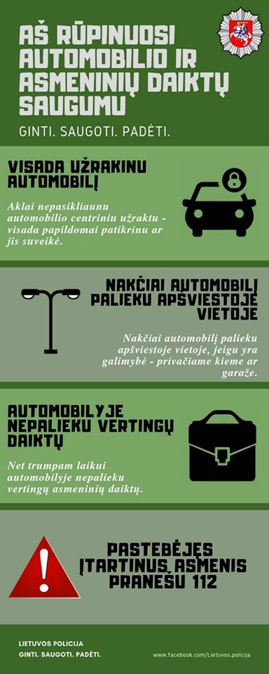 POLICIJA PRIMENA:*Palikdami automobilį nors ir trumpam, visada patikrinkite, ar įjungta, ar patikimai veikia apsaugos sistema. Niekada nepalikite atrakintų automobilio durų, atidarytų langų, stoglangių, matomoje vietoje – rankinių, mobiliųjų telefonų, dokumentų, kitų vertingų daiktų. *Rankines, dokumentus pasiimkite su savimi, nepalikite jų transporto priemonėje.