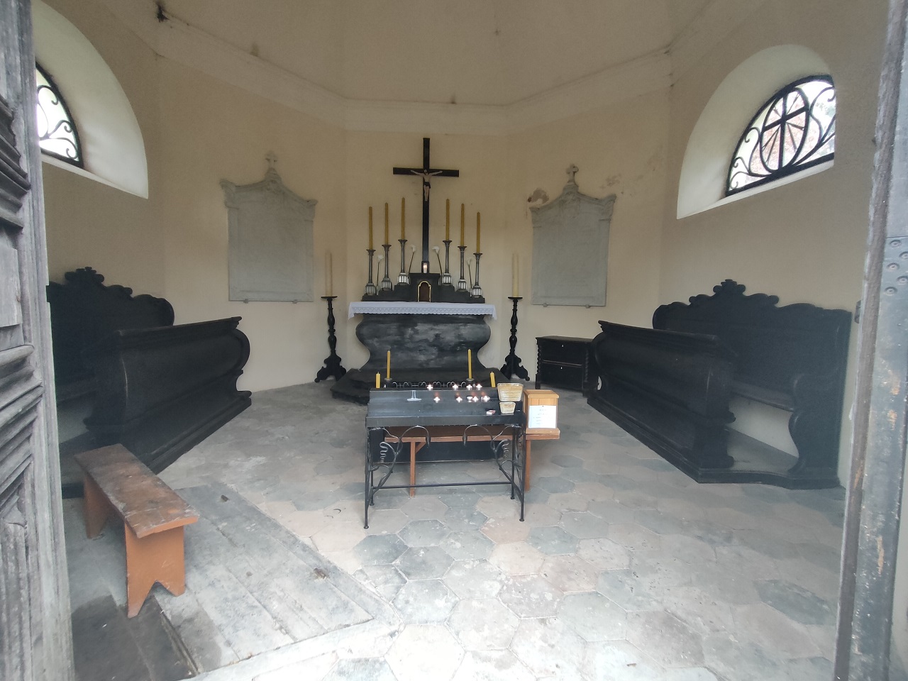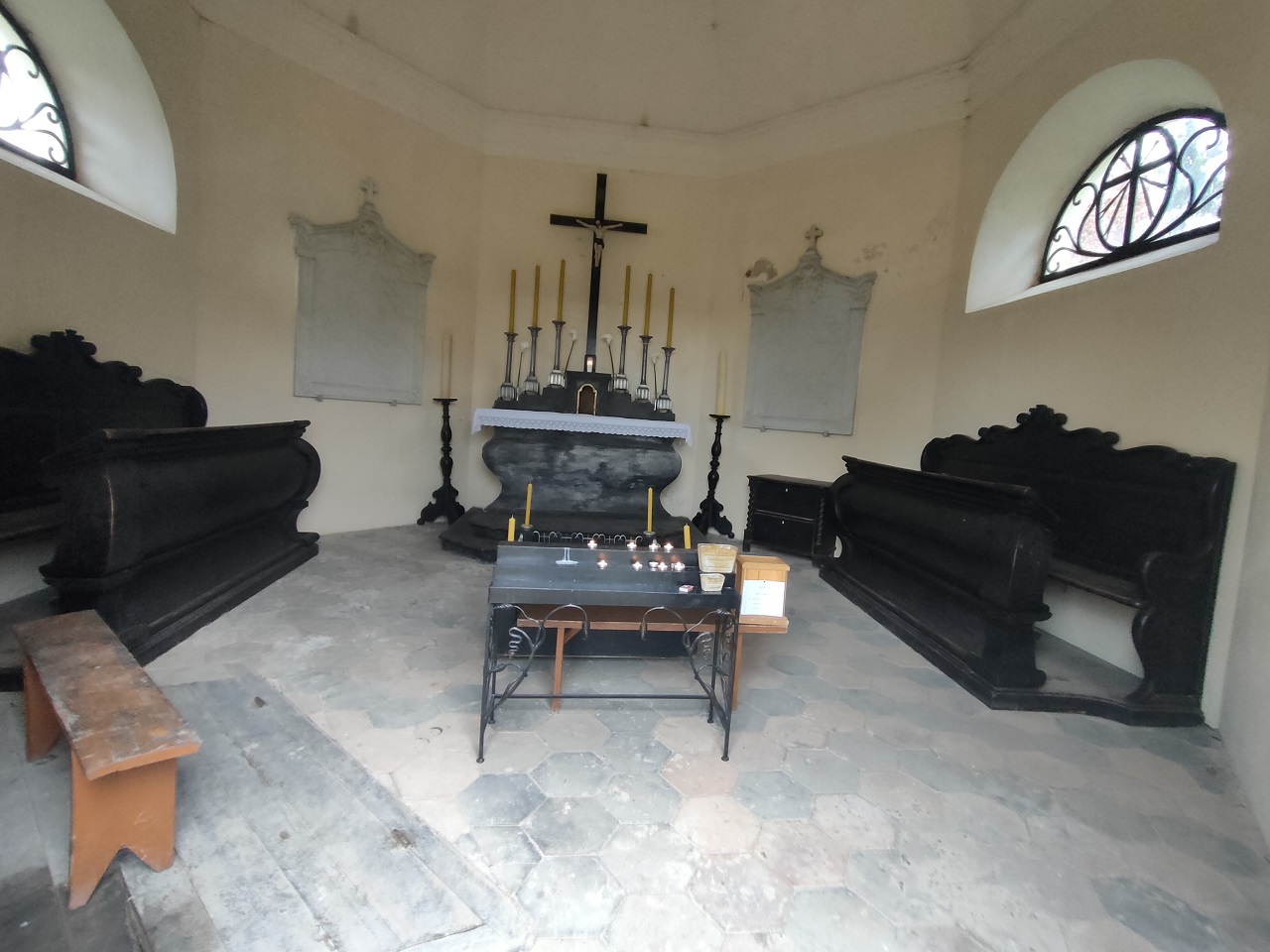 Sienas puošia 4 paminklinės marmurinės lentos, įmontuotos ant keturių priešingų sienų: