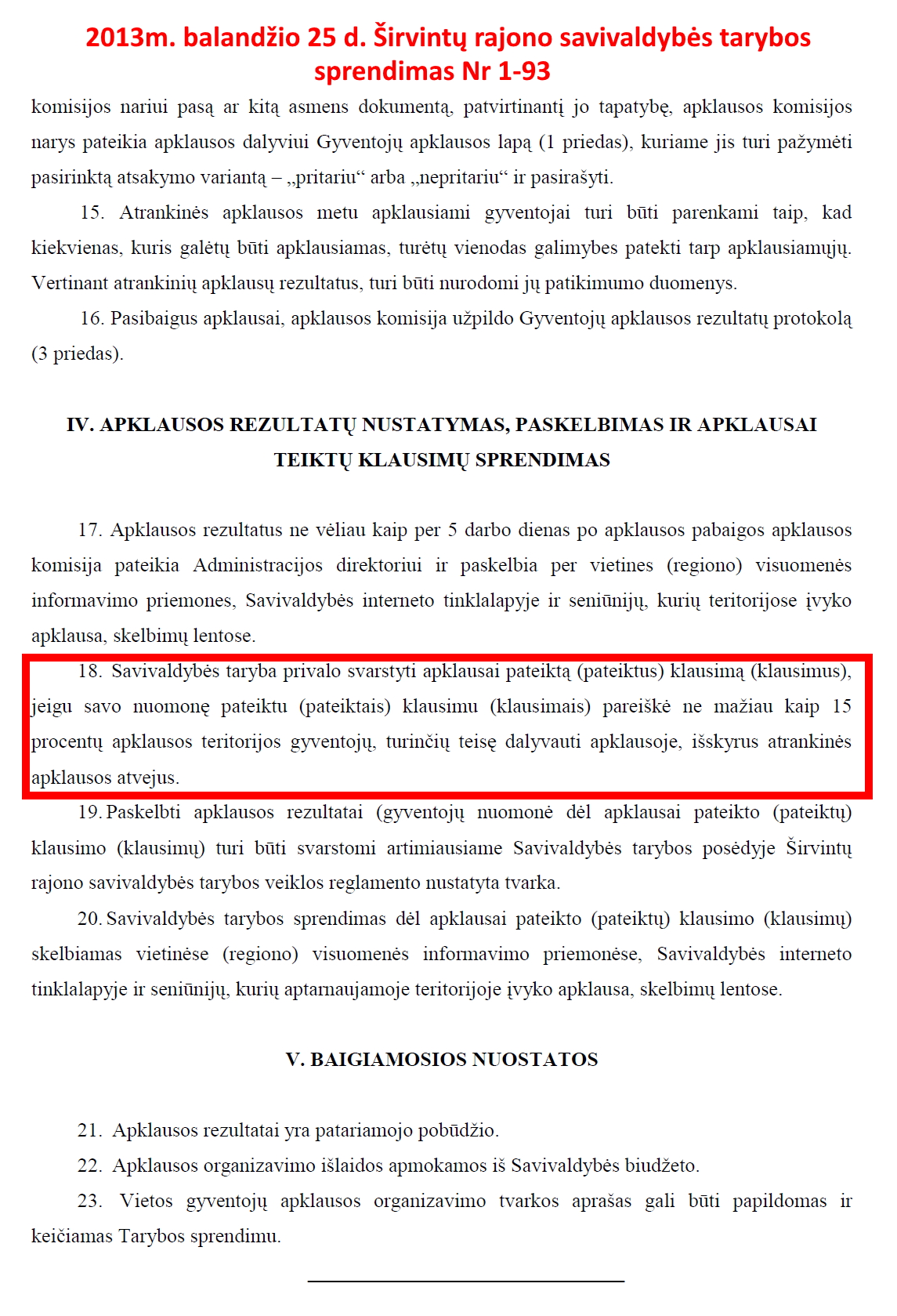 „18. Savivaldybės taryba privalo svarstyti apklausai pateiktą (pateiktus) klausimą (klausimus), jeigu savo nuomonę pateiktu (pateiktais) klausimu (klausimais) pareiškė ne mažiau kaip 15 procentų apklausos teritorijos gyventojų, turinčių teisę dalyvauti apklausoje, išskyrus atrankinės apklausos atvejus”