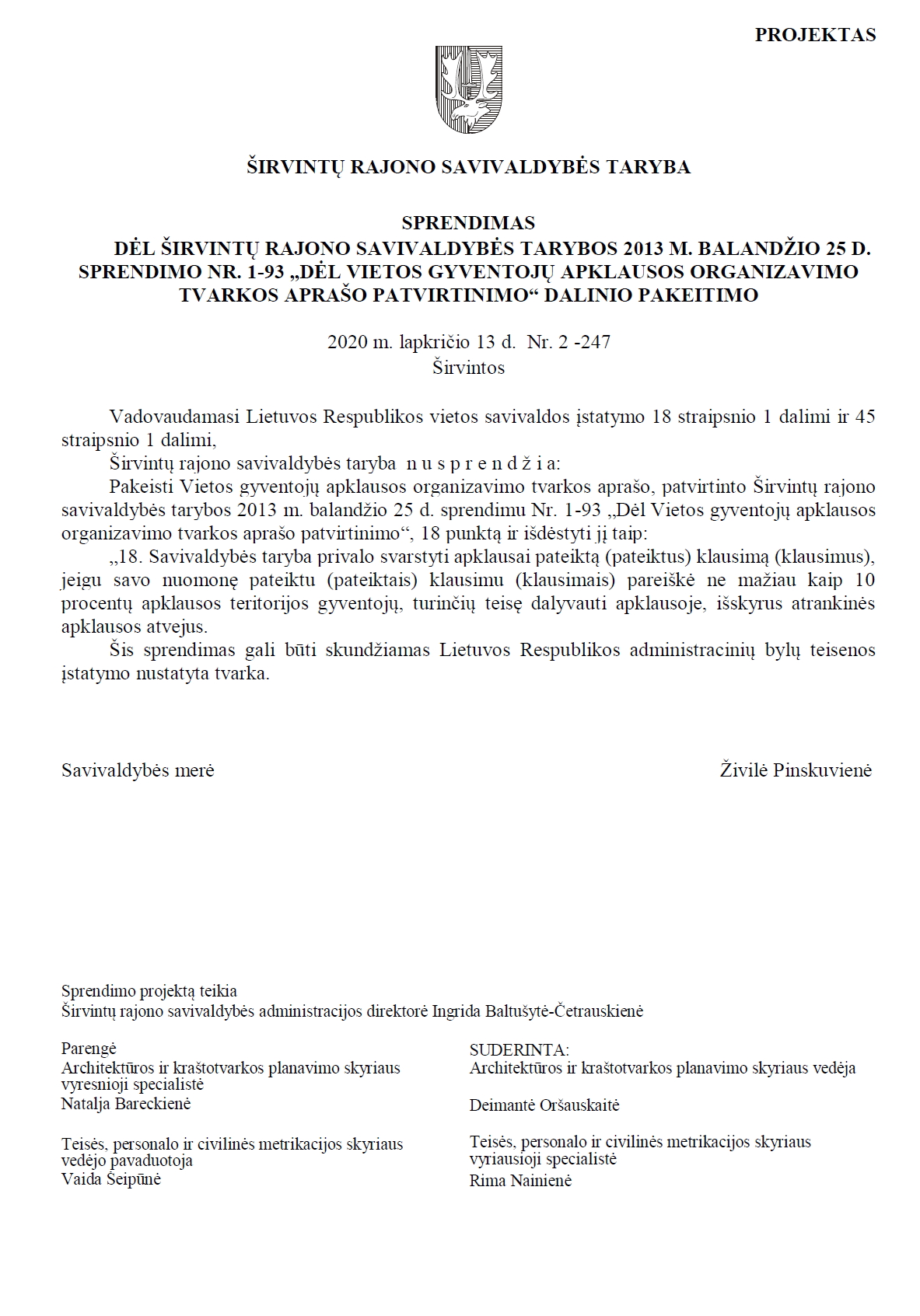 „Dėl Širvintų rajono savivaldybės tarybos 2013 m. balandžio 25 d. sprendimo Nr. 1-93 „Dėl Vietos gyventojų apklausos organizavimo tvarkos aprašo patvirtinimo“ dalinio pakeitimo”. Jo pagrindimas skamba taip: