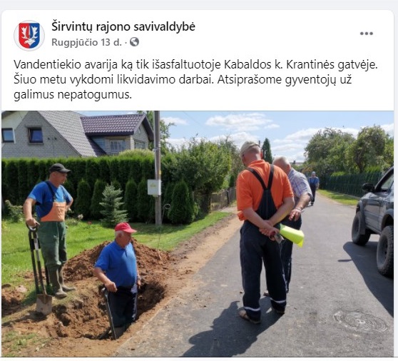 Ir štai – pagaliau – asfaltas atnaujintas, kelias lygus. Bet neilgai. Jau rugpjūčio 13 dieną savivaldybės facebook paskyroje atsiranda skelbimas (žiūrėti nuotrauką): „Vandentiekio avarija ką tik išasfaltuotoje Kabaldos k. Krantinės gatvėje. Šiuo metu vykdomi likvidavimo darbai. Atsiprašome gyventojų už galimus nepatogumus.” Žinoma, patenkintų nebuvo, kad ką tik atnaujintas asfaltas, o jau vėl kasama. Tačiau gyventojus ramino faktas, kad sureaguota ir viešai informuota. Kniso, ardė, taisė. Bet sutaisė.