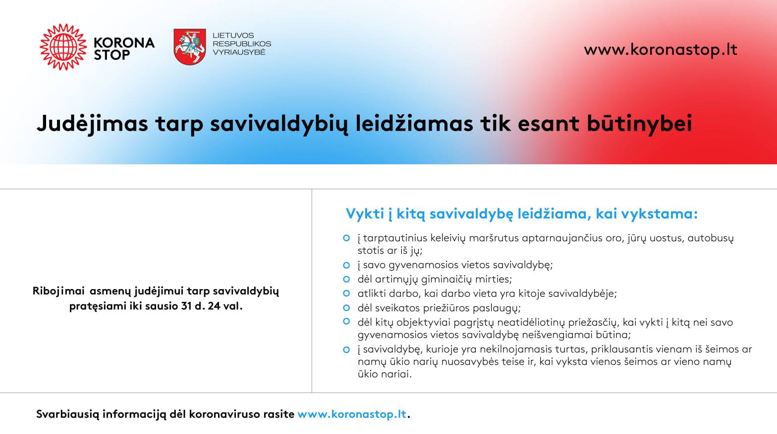 Pratęsta judėjimo tarp savivaldybių ribojimai iki sausio 31 dienos 24:00 val. Vilniaus apskrities vyriausiojo policijos komisariato Širvintų rajono policijos komisariato pareigūnai ypatingą dėmesį skirs judėjimo tarp savivaldybių, buriavimosi viešose vietose ir bendravimo tarp skirtingų šeimų ar namų ūkių kontrolei. Policijos pareigūnai rajono teritorijoje gali patikrinti važiuojančiu transportu vykstančių piliečių leistinumą būti šios savivaldybės ribose.