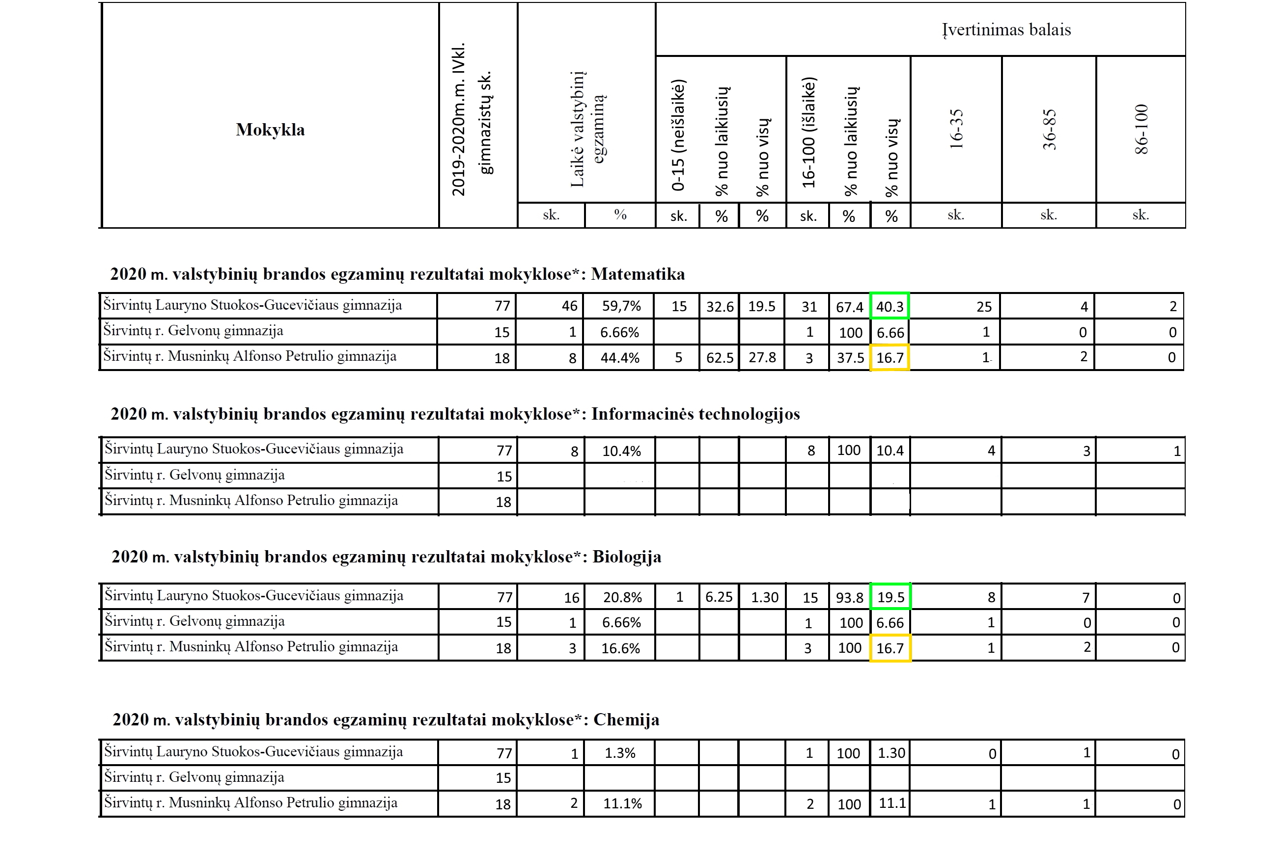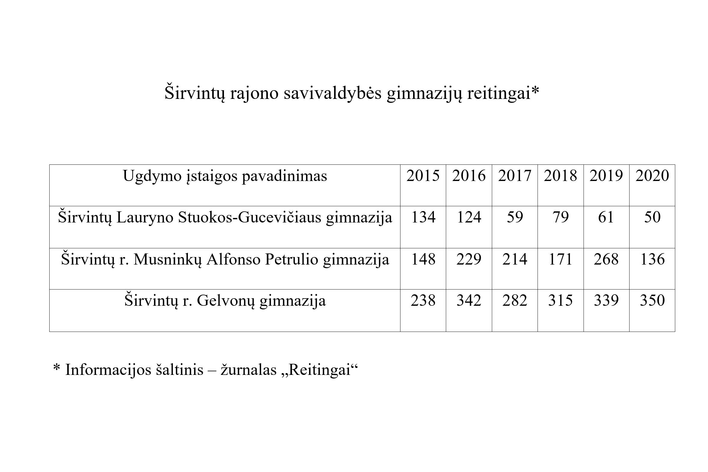2020 metais Širvintų Lauryno Stuokos Gucevičiaus gimnazija yra 50-oje vietoje, Musninkų Alfonso Petrulio gimnazija 126-oje vietoje, o Gelvonų gimnazija yra 350-oje vietoje. Bet gal tai atsitiktinumas? Kaip gimnazijoms sekėsi 2015 – 2019 metais? Širvintų LSG gimnazija – 134, 124, 59, 79 ir 61 vietos. Musninkų gimnazija – 148, 229, 214, 171 ir 268 vietos. Gelvonų gimnazija – 238, 342, 282, 315, 339 vietos.