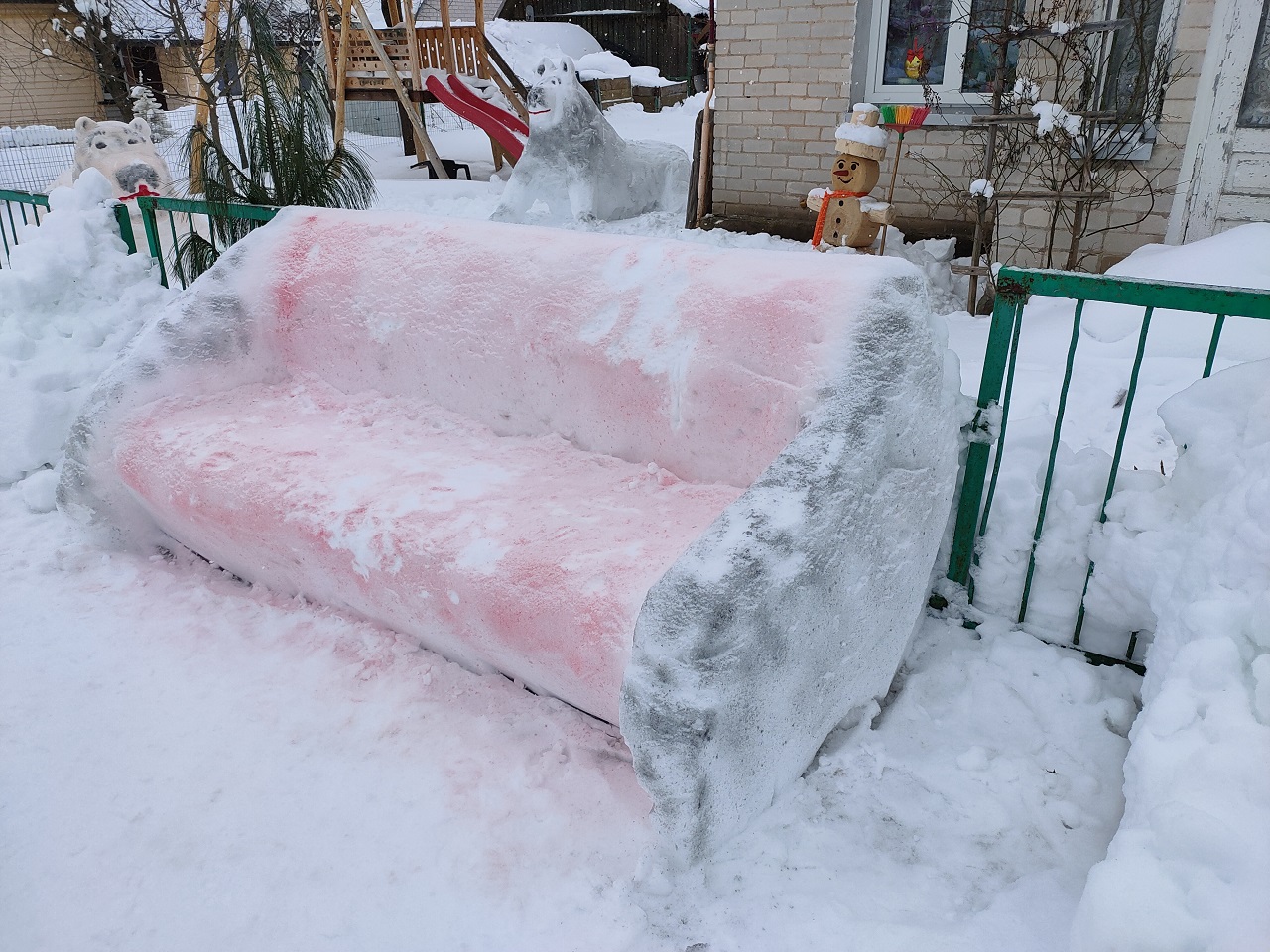 Iškritus pirmam didesniam sniegui Arvydas nukasė šaligatvį palei savo tvorą. Gavosi nemažas sniego kalnas. Tuomet darbštus ir kūrybingas vyras sugalvojo – reikia kažkuo tą kalną paversti. Taip gavosi dailus suolelis. „Na, tik prisėsti ant jo gal nerekomenduočiau,“ – juokiasi vyras. Suolelį nudažė guašu. Jis gavosi toks tikroviškas, kad vieną dieną Arvydo jaunystės draugas, eidamas pro šalį, pakomentavo, kaip jam pasisekė, kad komunalinis suoliuką prie namų pastatė. Net pasakius, kad tai suoliukas iš sniego, ne iš karto draugas patikėjo. Dar kartą nueidama atsisuku į suoliuką. Ne, tai jau net ne suoliukas, o minkšatsuolis, ant kurio visai smagu būtų praeiviui ir prigulti…