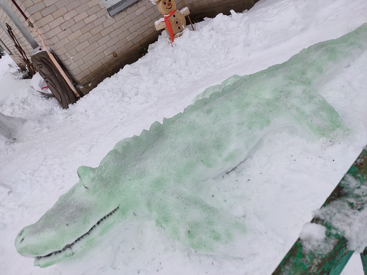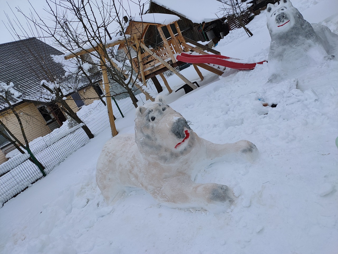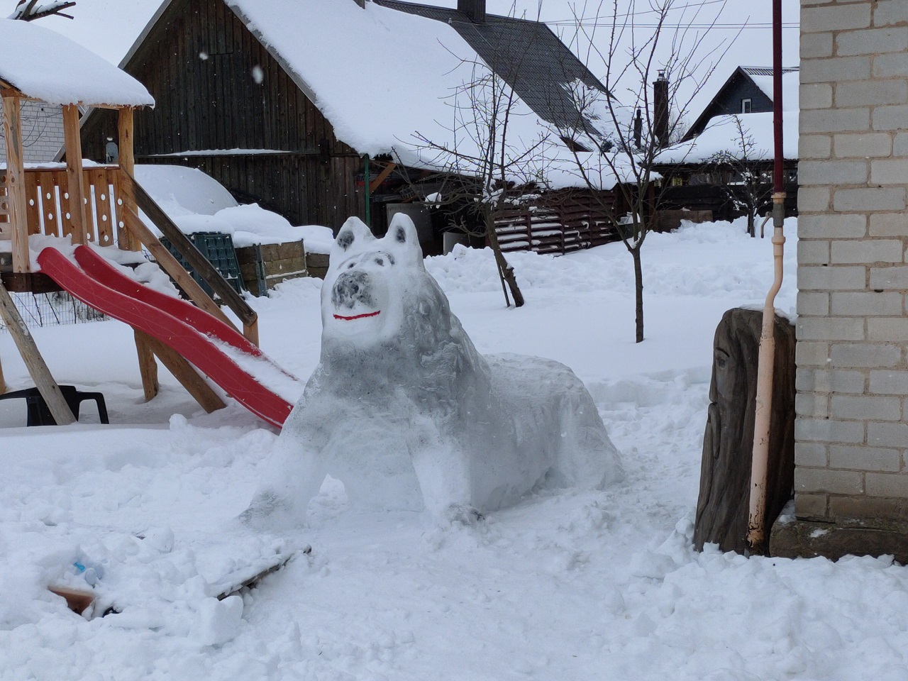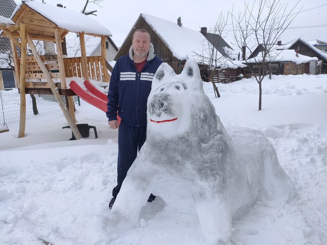 Pirmas gyvūnas Dačkų kieme išaugo sausio pradžioje – nedidelis liūtas. Tiesa, jis jau spėjo ištirpti. Tad kai gamta drėbtelėjo sniego – Arvydas gavo nemokamos medžiagos kūrybai. Vyras pasakoja, kad vakare sugalvoja, ką darys, o iš ryto imasi veiklos. Kartu ir kiemą nusikasa, ir jį papuošia. Vyras juokėsi, kol kas sniego iš savo kiemo pakanka, dar rezervo turi – sniegas nuo daržo. Tad į kaimynų kiemus dairytis netenka. Jo žmona Rima juokiasi: ji pati jam nepadeda lipdyti. Šeima darbais pasidalijo – vyras lipdo, o ji fotografuojanti.