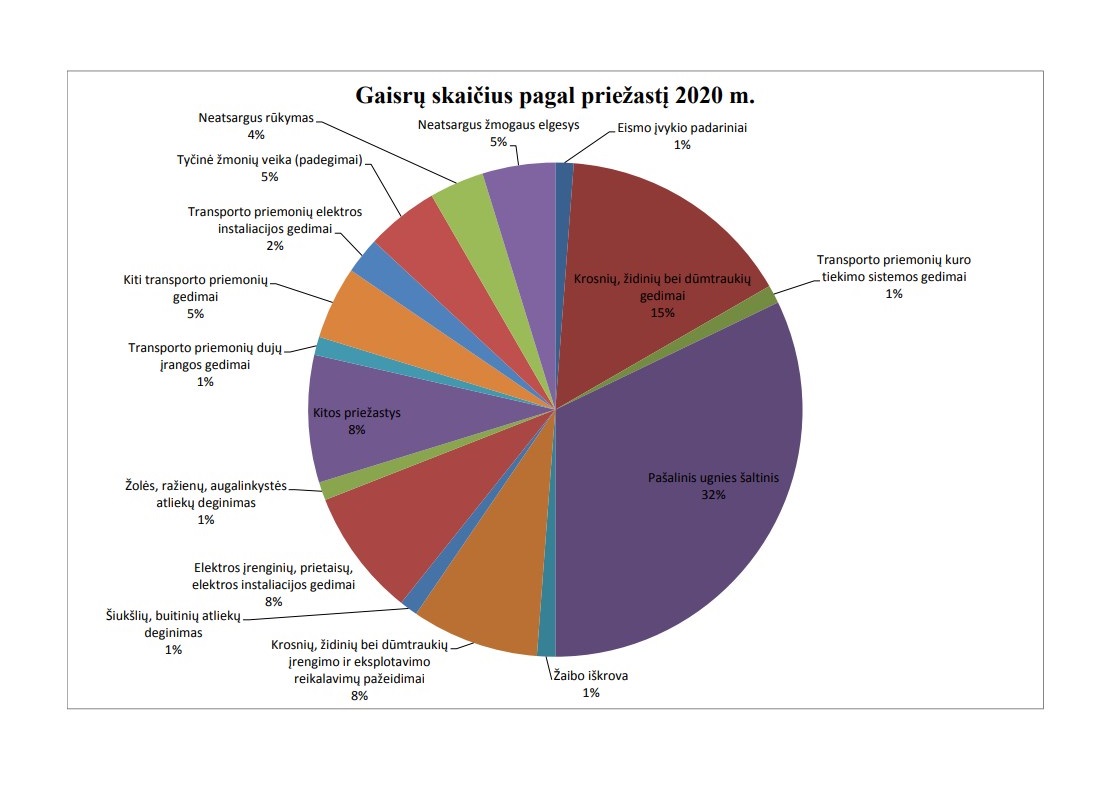 2020 metais žmonės atsakingiau elgėsi su ugnimi. Beveik tris kartus sumažėjo gaisrų skaičius dėl neatsargaus žmonių elgesio. Taip pat daugiau nei du kartus sumažėjo pašalinio ugnies šaltinio sukeltų gaisrų skaičius. Praėjusiais metais gaisrai dažniau kilo dėl elektros įrenginių, prietaisų, elektros instaliacijos gedimų. Dažna gaisrų priežastimi liko krosnių, židinių bei dūmtraukių gedimai ir eksploatavimo reikalavimų pažeidimai.