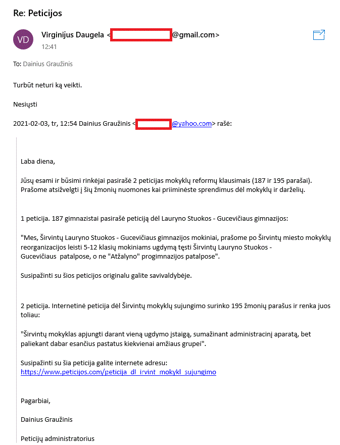 Visą informaciją ir parašus, surinktus dviejų skirtingų peticijų metu (viena tėvų ir mokytojų, kita – gimnazistų), kaip iniciatorius, Dainius išsiuntė visiems Tarybos nariams.
