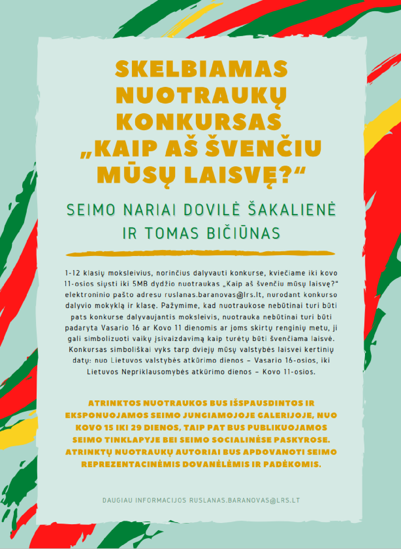 Mūsų visų – istorikų, mokytojų, politikų, žurnalistų, tėvų – pareiga yra perduoti vaikams Lietuvos istoriją ir meilę laisvei, bet kiekviena karta neišvengiamai Lietuvos laisvę suvokia savaip. Todėl Seimo nariai Dovilė Šakalienė ir Tomas Bičiūnas skelbia 1–12 klasių moksleivių nuotraukų konkursą „Kaip aš švenčiu mūsų laisvę?“ Jis simboliškai vyks tarp dviejų mūsų valstybės laisvei kertinių datų: nuo Lietuvos valstybės atkūrimo dienos – Vasario 16-osios, iki Lietuvos Nepriklausomybės atkūrimo dienos – Kovo 11-osios.