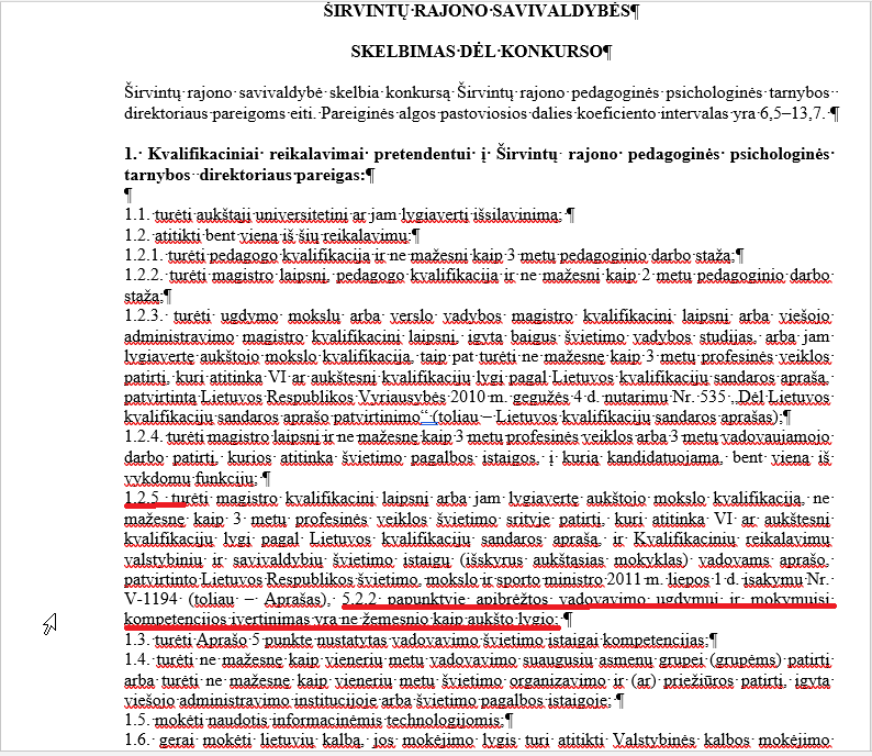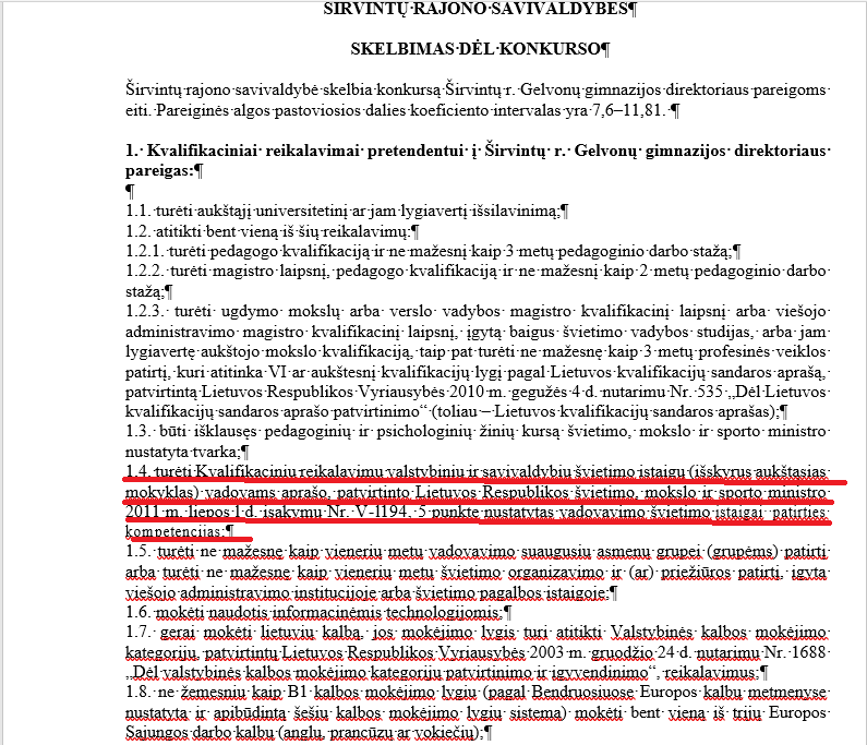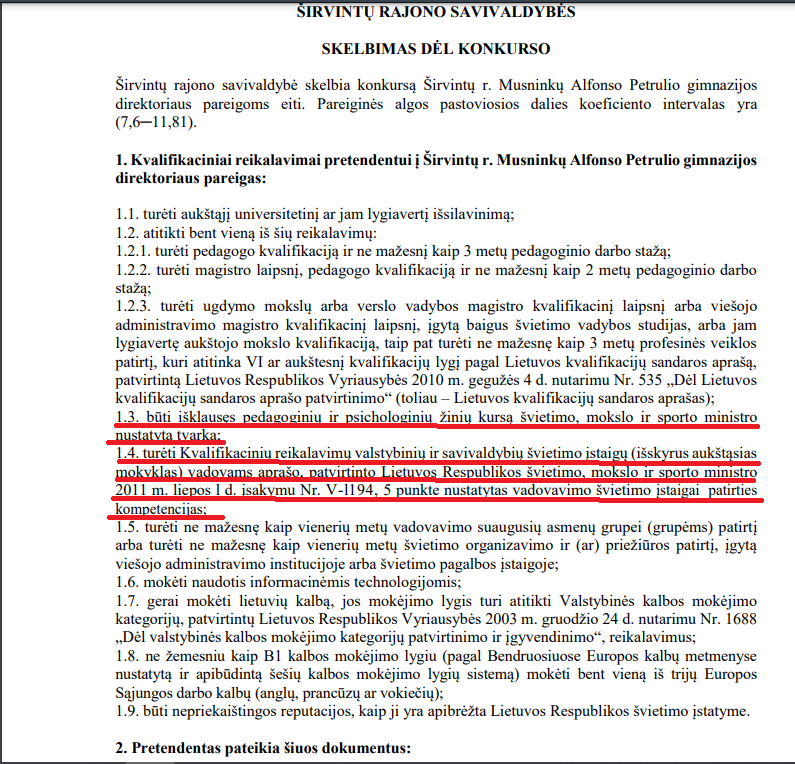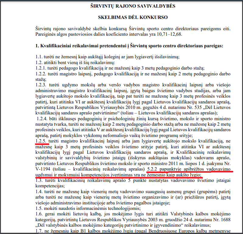 Širvintų r. PPT ir Širvintų sporto centro skelbime yra toks reikalavimas: „5.2.2 papunktyje apibrėžtos vadovavimo ugdymui ir mokymuisi kompetencijos įvertinimas yra ne žemesnio kaip aukšto lygio;“