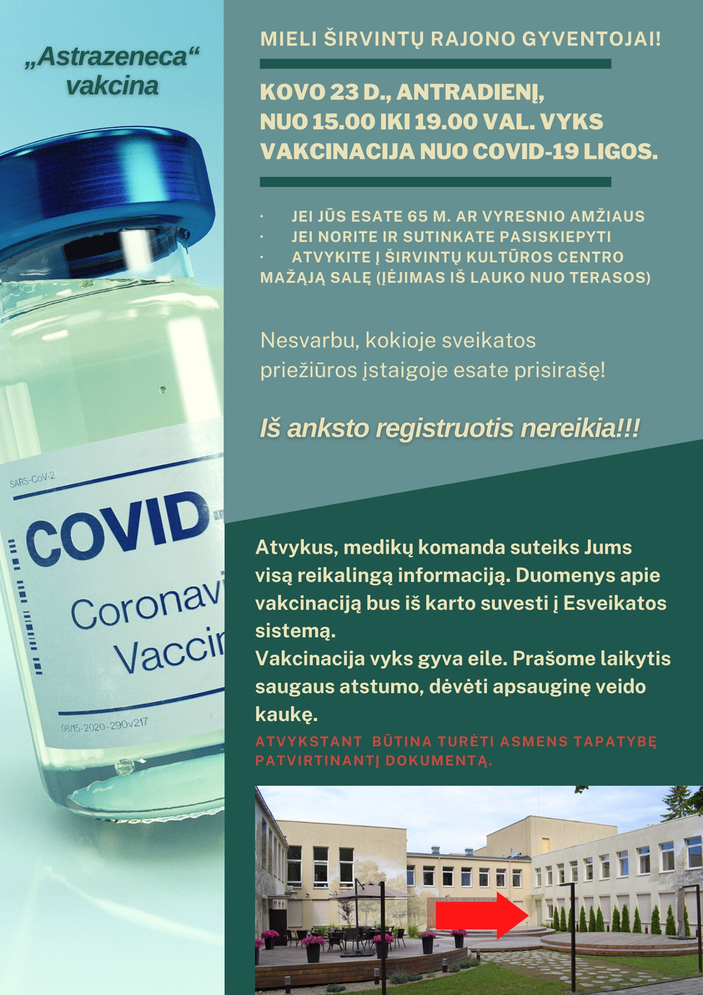 Aukščiausiems šalies vadovams pasiskiepijus „Astrazeneca“ vakcina, primename, kad rytoj Širvintų vakcinacijos centre vyks akcija, skirta visiems 65+ amžiaus Širvintų r. gyventojams!