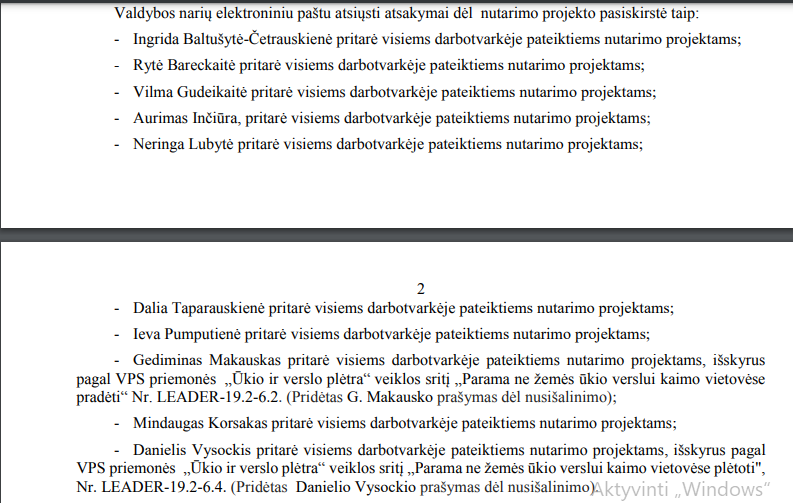 – Mūsų rajono VVG valdyba tuo metu, kai buvo priimtas sprendimas, buvo tokia: 1. Ingrida Baltušytė-Četrauskienė; 2. Neringa Lubytė; 3. Rytė Kružikė; 4. Dalia Taparauskienė; 5. Gediminas Makauskas; 6. Ieva Pumputienė; 7. Mindaugas Korsakas; 8. Vilma Dainienė; 9. Aurimas Inčiūra; 10. Arūnas Martinėlis; 11. Danielis Vysockis.